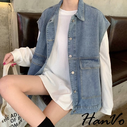 【HanVo】時髦感大口袋工裝牛仔背心 率性街頭男友風穿搭 百搭寬鬆單寧背心外套 女生衣著 A07-4921