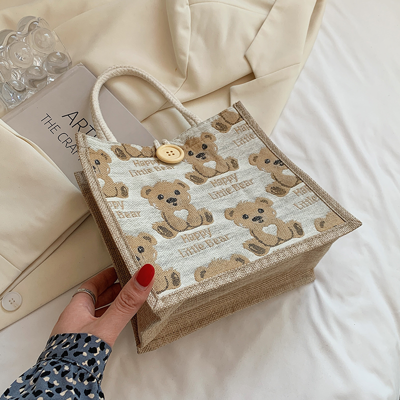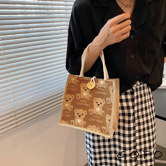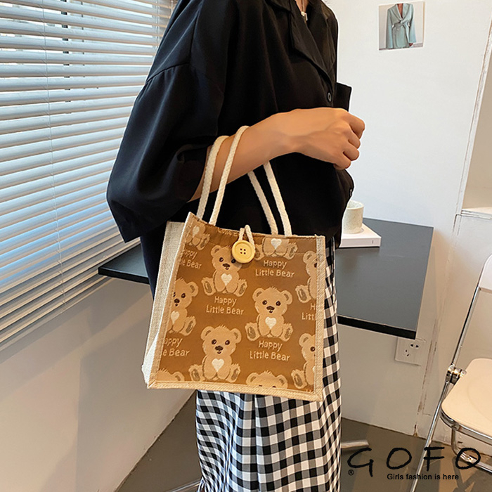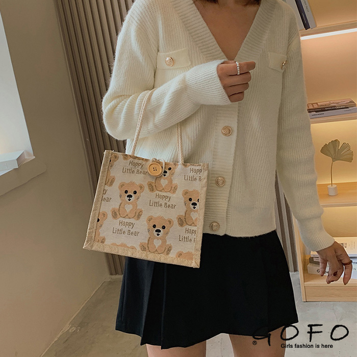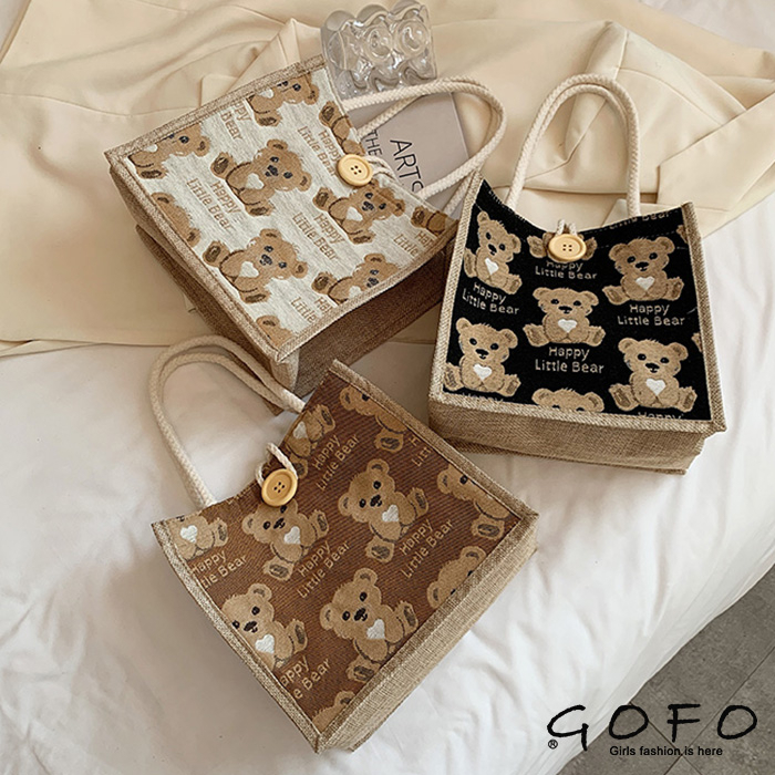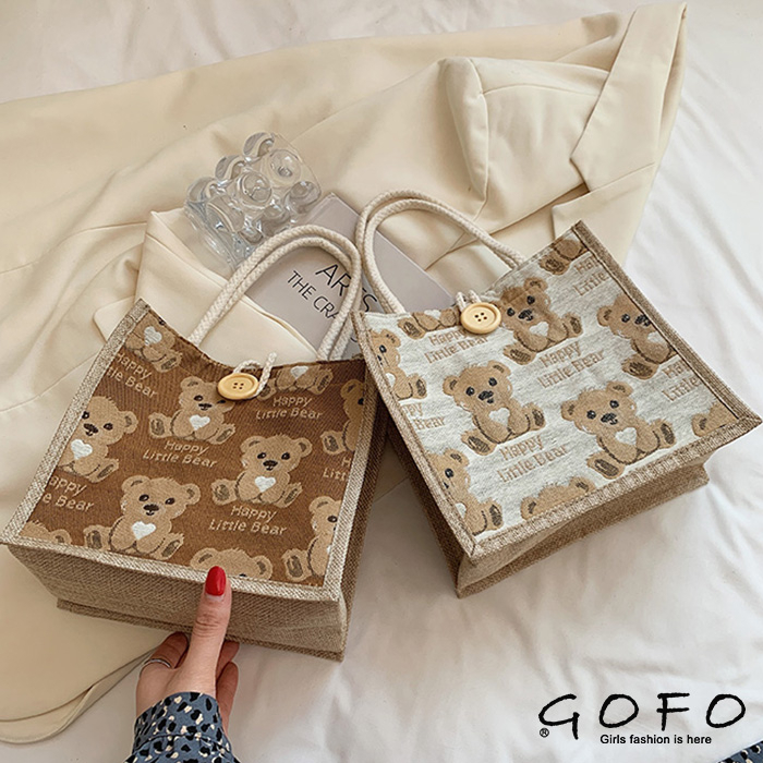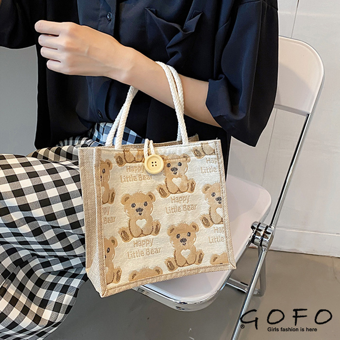 GOFO 包包 亞麻小熊圖案 韓系穿搭 隨身包 帆布包 亞麻包 買菜包 手拎包 手拿包 休閒包 手提包