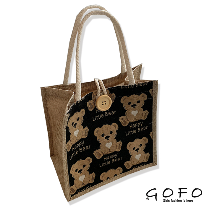 GOFO 包包 亞麻小熊圖案 韓系穿搭 隨身包 帆布包 亞麻包 買菜包 手拎包 手拿包 休閒包 手提包黑色|米色|褐色GOFO 台灣賣家 台灣出貨 台灣現貨