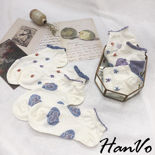 【HanVo】愛戀小熊藍紫花邊短襪 韓系簡約百搭舒適棉質襪 韓國潮流時尚休閒襪 女生配件 A12-6136