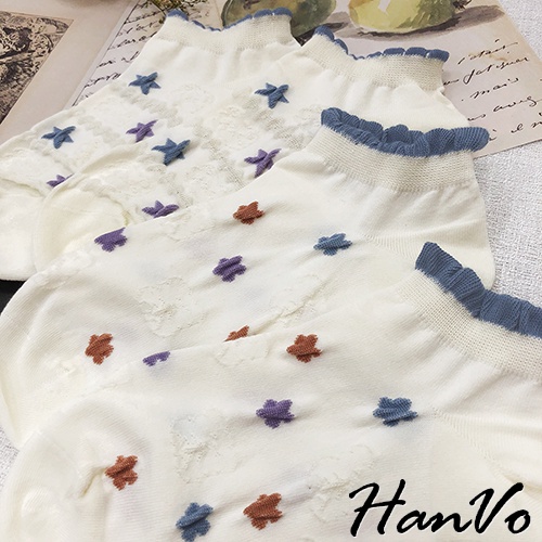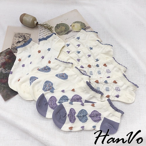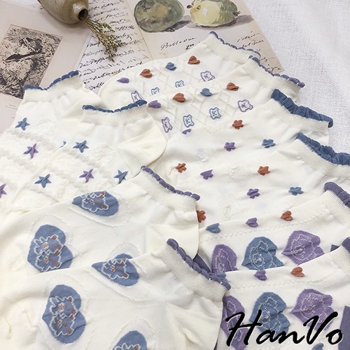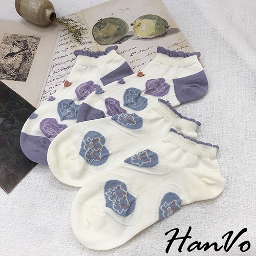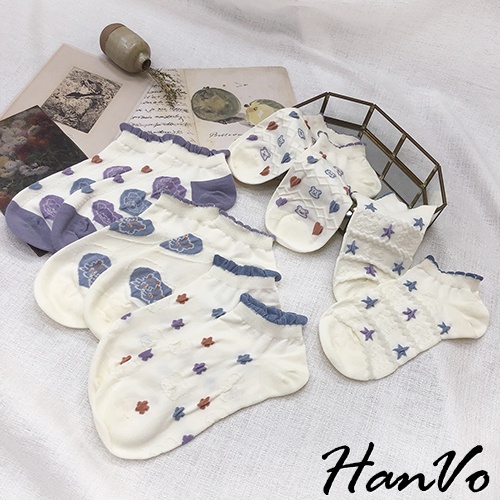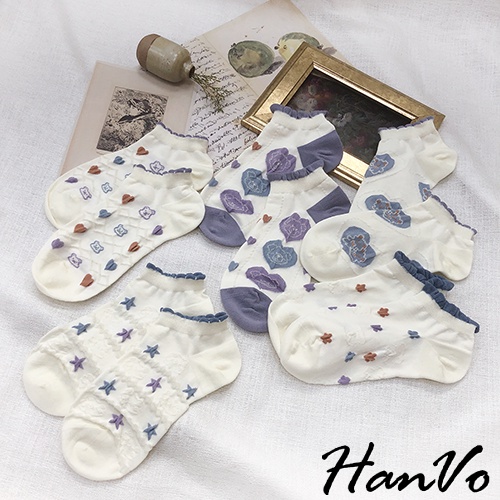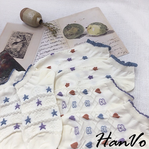 【HanVo】愛戀小熊藍紫花邊短襪 韓系簡約百搭舒適棉質襪 韓國潮流時尚休閒襪 女生配件 A12-6136紫愛心熊|花花熊仔|菱格小熊|星星小熊|藍心熊熊SocksHanVo Wear Collection