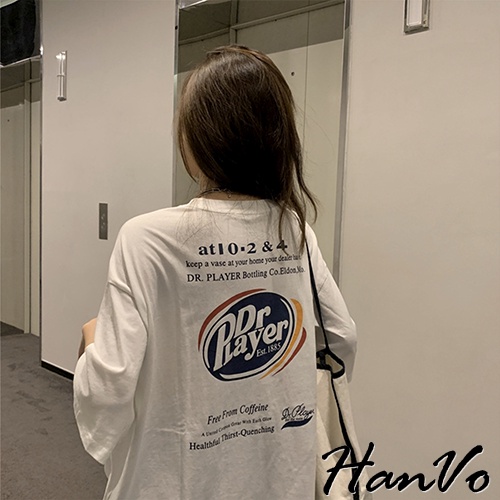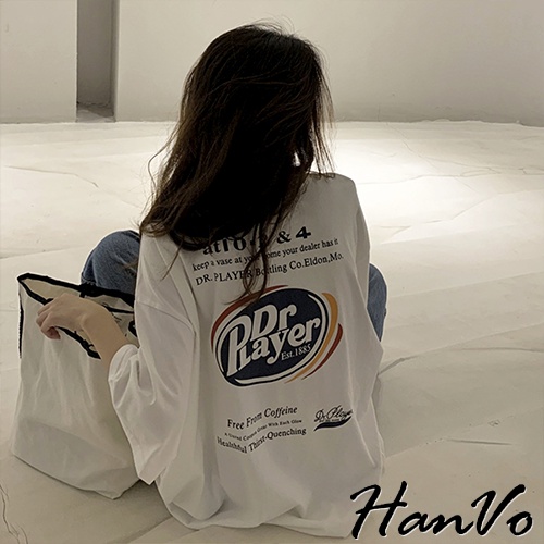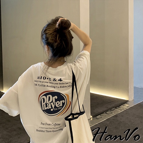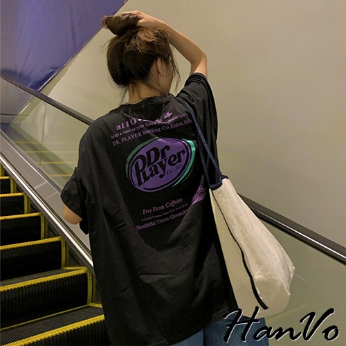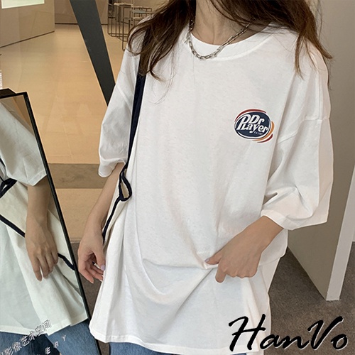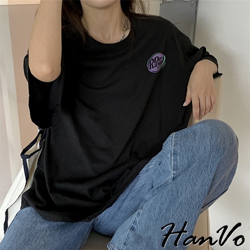 【HanVo】三色橢圓形標籤後背大圖T恤 韓版休閒百搭顯瘦圓領短袖上衣 簡約時尚T恤 女裝 女生衣著A01-1361黑色|白色T-shirtsHanVo Wear Collection