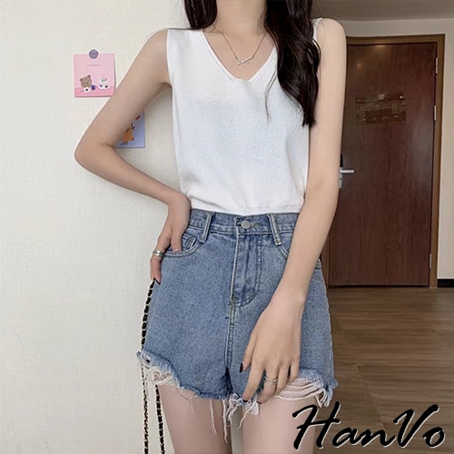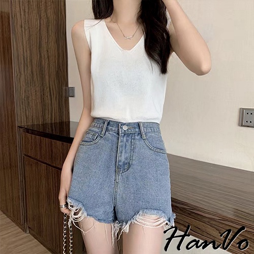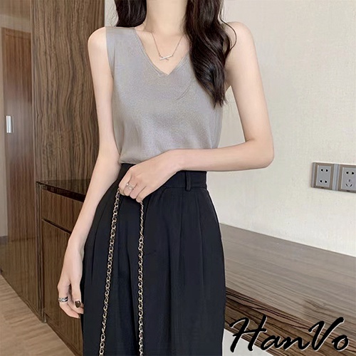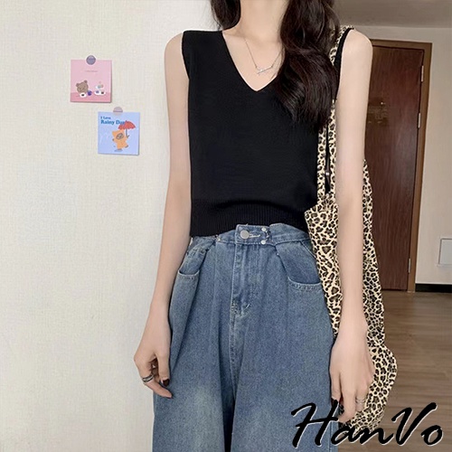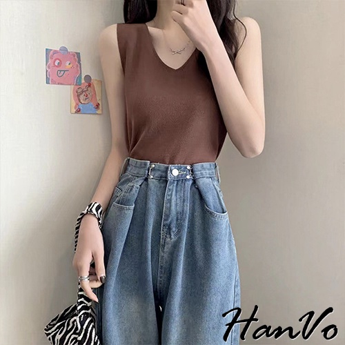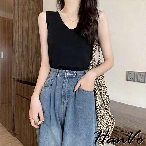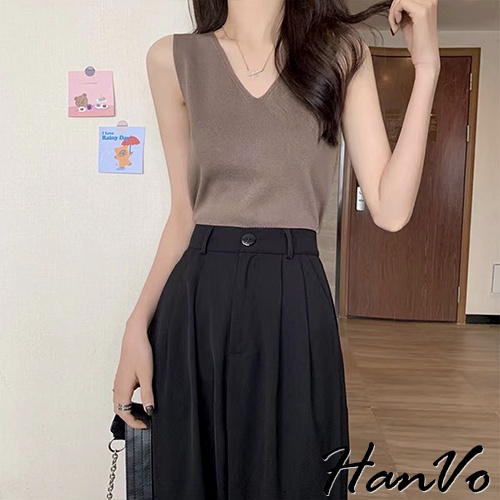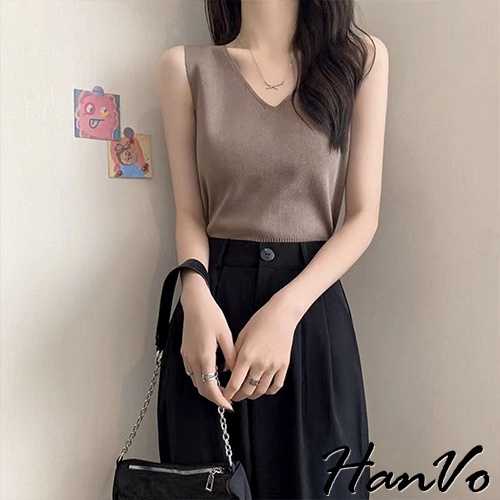 【HanVo】薄款V領寬肩針織背心 韓系休閒百搭V領合身針織背心上衣 韓系女裝 女生衣著 A01-1391黑色|白色|灰色|杏色|燕麥|咖色Tanks & CamisolesHanVo Wear Collection