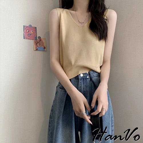 【HanVo】薄款V領寬肩針織背心 韓系休閒百搭V領合身針織背心上衣 韓系女裝 女生衣著 A01-1391