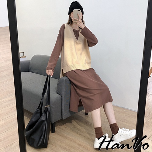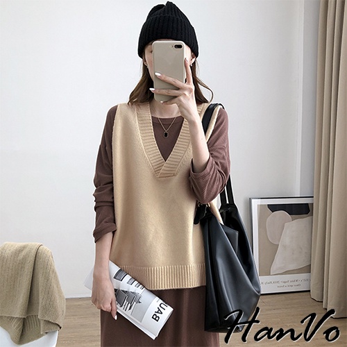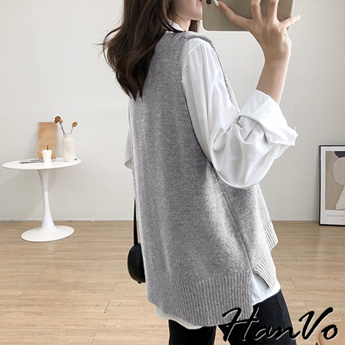 【HanVo】V領寬肩前短後長針織背心 韓系時髦百搭寬鬆顯瘦修身外搭背心 韓國女裝 女生衣著 A07-4959黑色|咖啡|灰色|杏色VestsHanVo Wear Collection