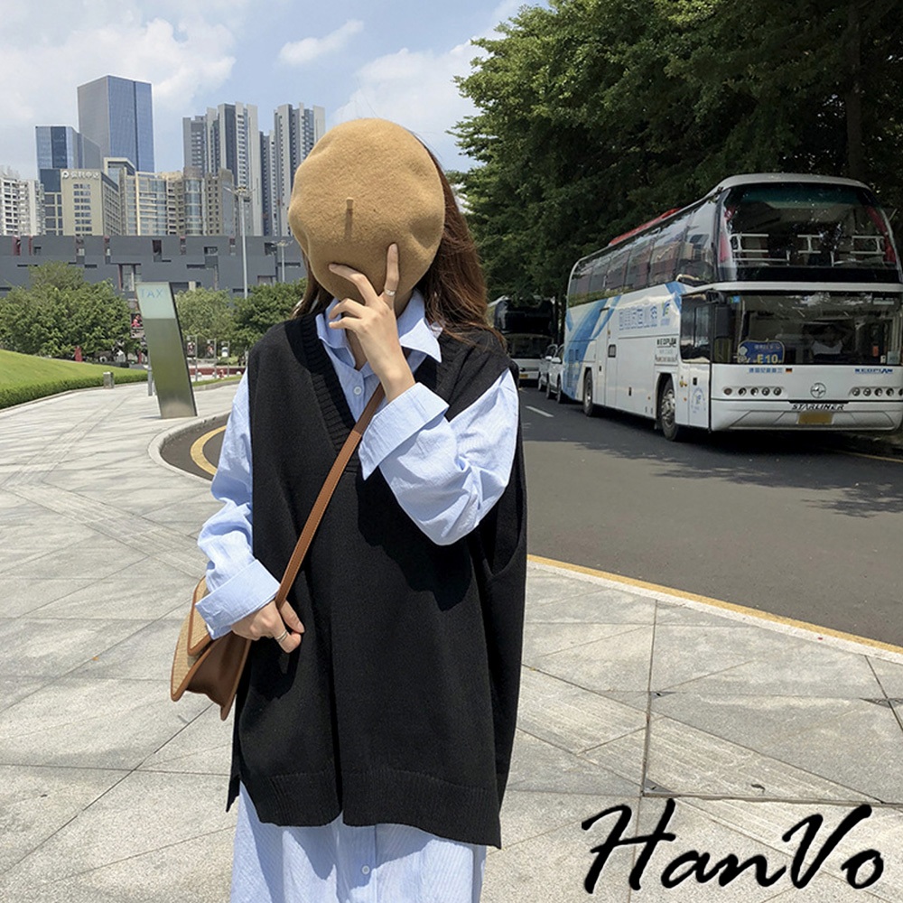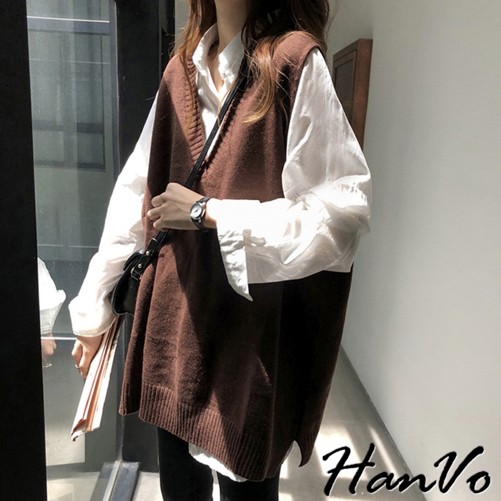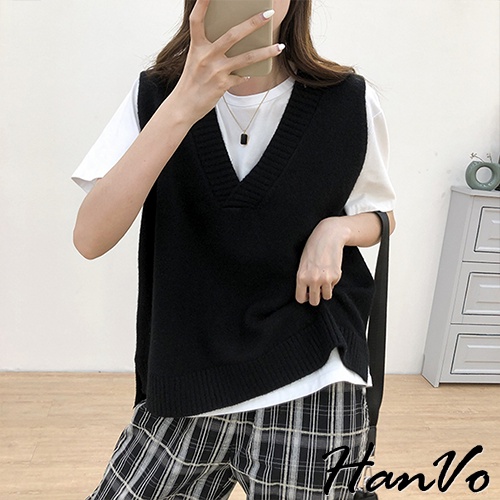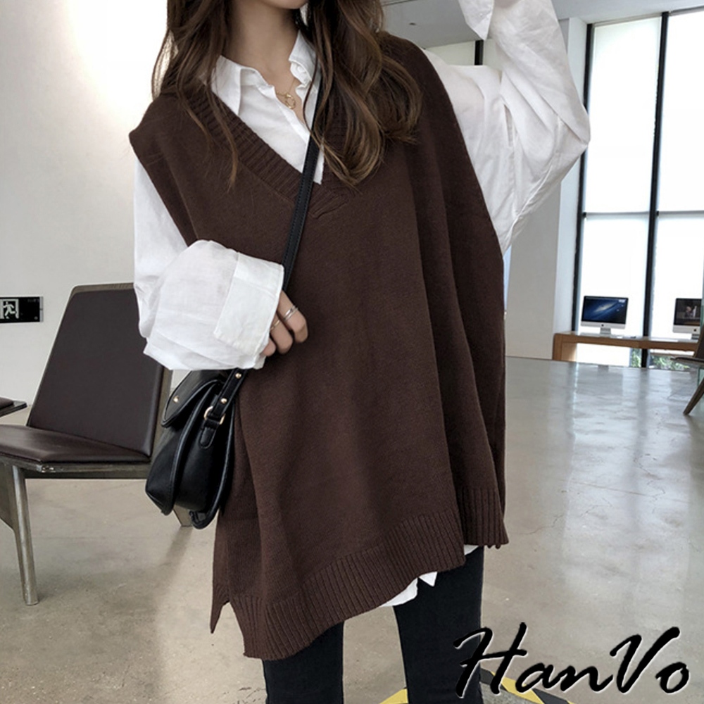 【HanVo】V領寬肩前短後長針織背心 韓系時髦百搭寬鬆顯瘦修身外搭背心 韓國女裝 女生衣著 A07-4959