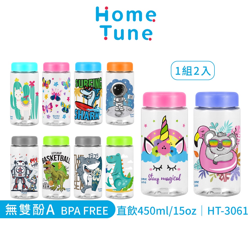 Home Tune家音透明印花旋蓋直飲水壺15oz/450ml(一組2入)|兒童水壺冷水壺防漏水壺冷水瓶_HT-3061獨角獸無尾熊|機器人與恐龍|鯊魚與宇宙|鯊魚與恐龍|美人魚獨角獸|羊駝與蝴蝶|貓咪與海灘UtensilsHome Tune家音