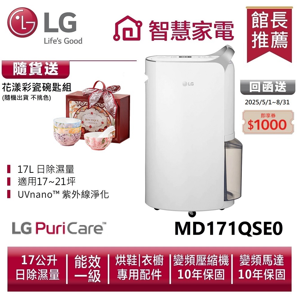 LG樂金 MD171QSE0 UV抑菌 WiFi變頻除濕機-晶鑽銀/17公升 送花漾彩瓷碗匙組MD171QSE0|限時特賣│MD171QSE0Air TreatmentLG旗艦館