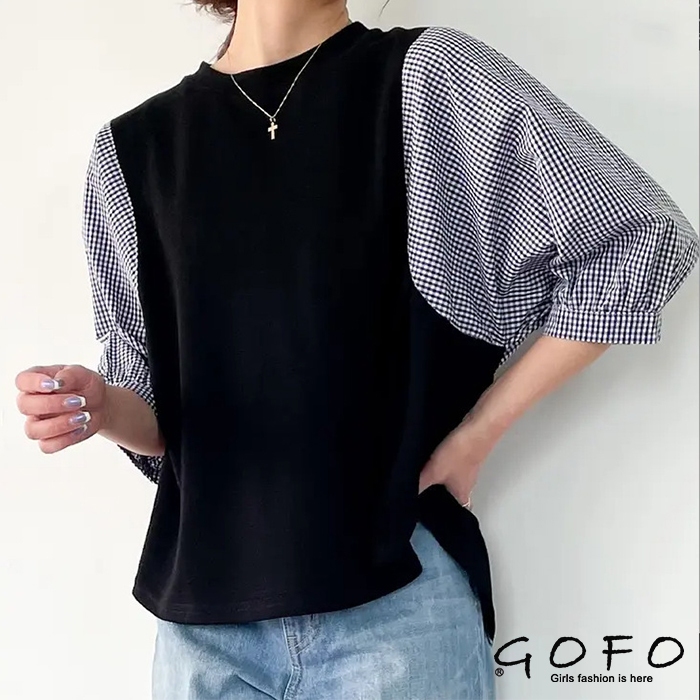 GOFO 短袖上衣 韓系穿搭 顯瘦 遮肉蝙蝠袖 異材拼接格子 圓領t恤 女生衣著 女裝上衣 夏天 夏季 女裝