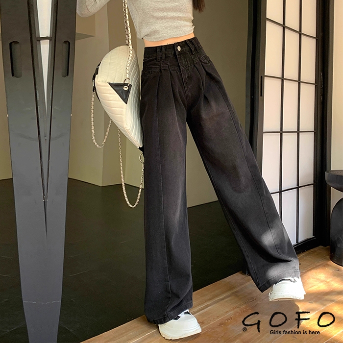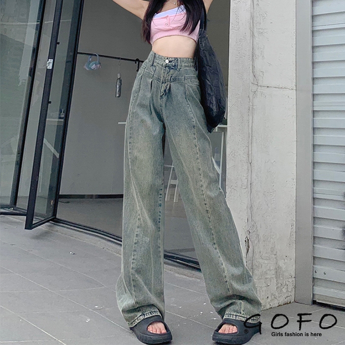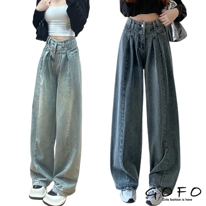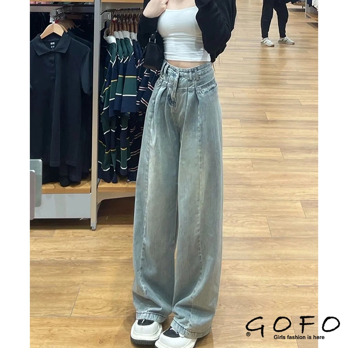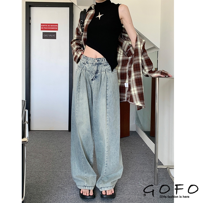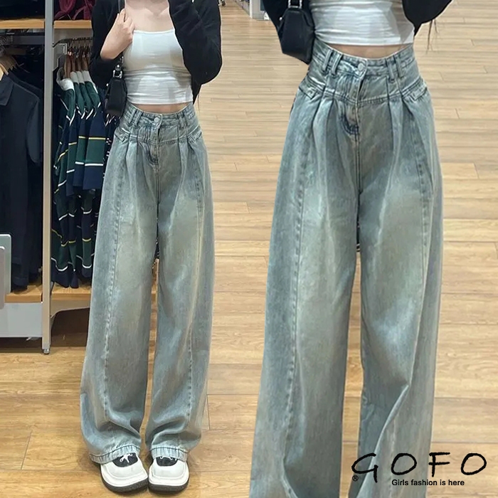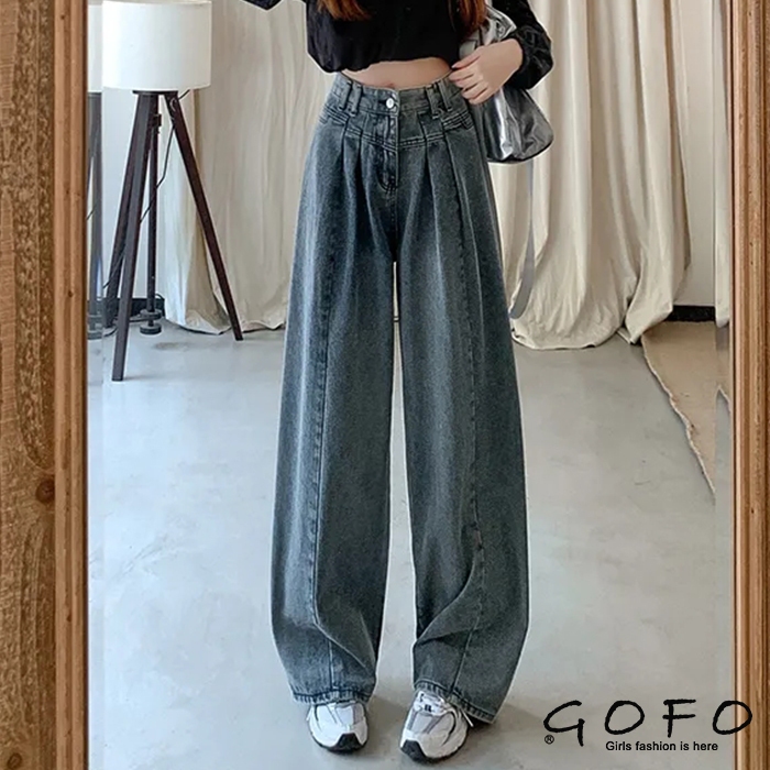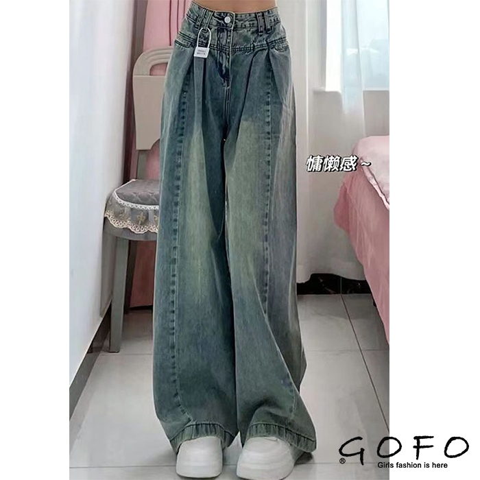 GOFO 長褲 韓系復古藍 水洗 高腰顯瘦 寬鬆遮肉 闊腿褲 寬褲 垂墜感打摺 牛仔褲 四季褲 街頭風 女生褲子 女裝