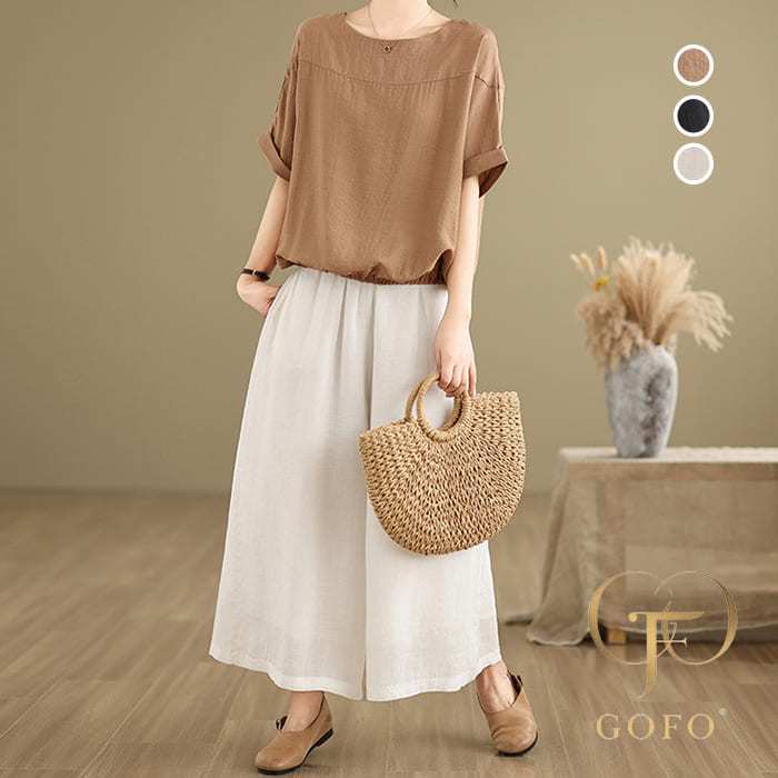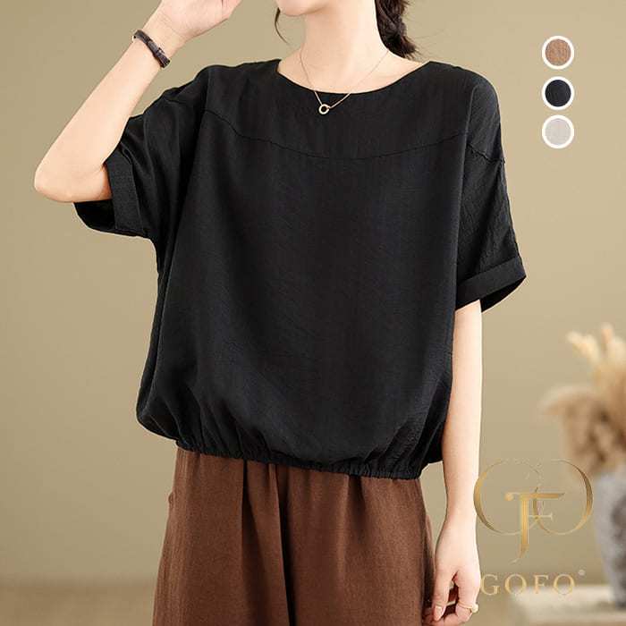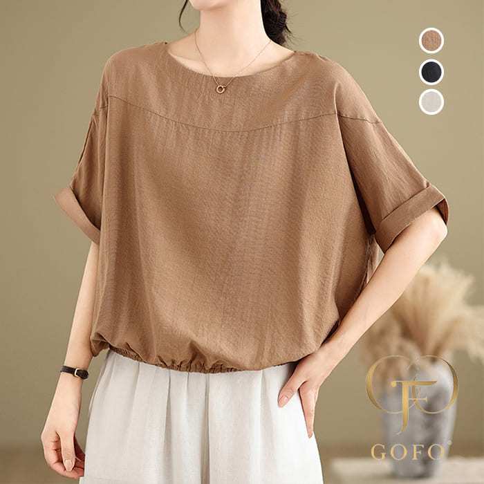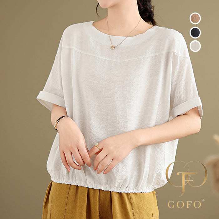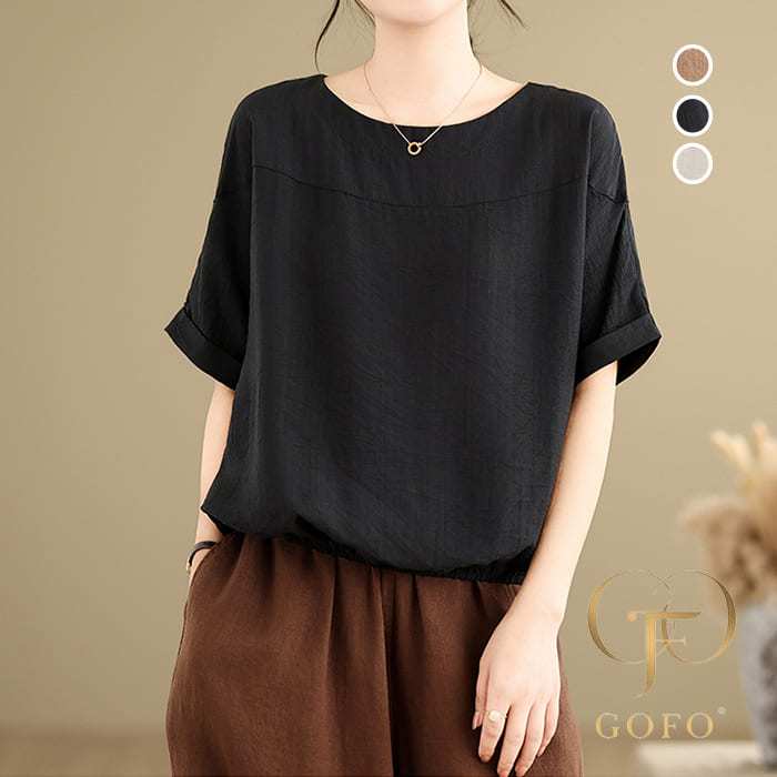 GOFO 短袖上衣 中大尺碼 韓系穿搭 涼感纱 設計感拼接 顯瘦遮肉蝙蝠袖 素面圓領t恤 寬鬆 夏季服飾 女生 女裝