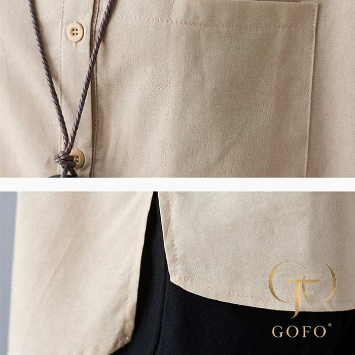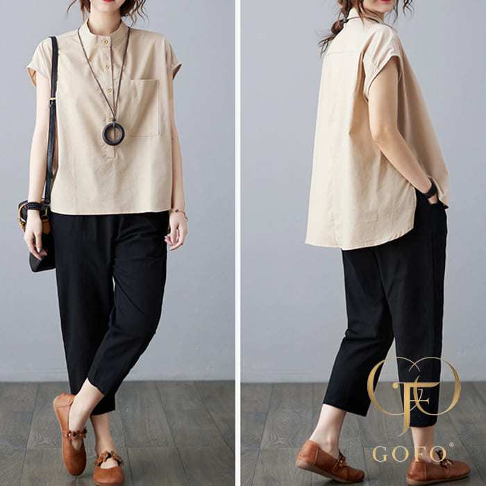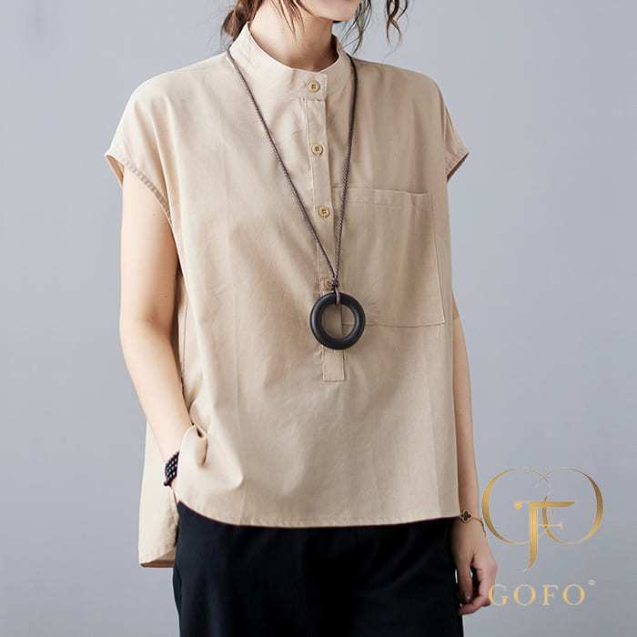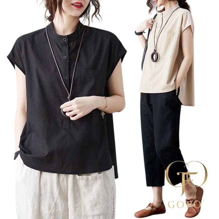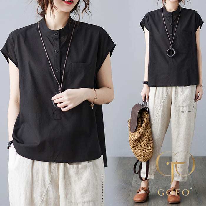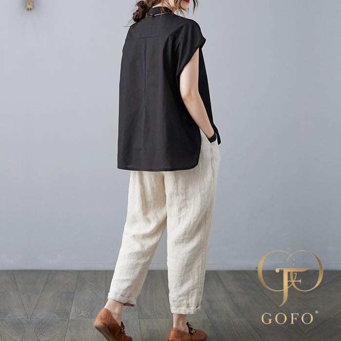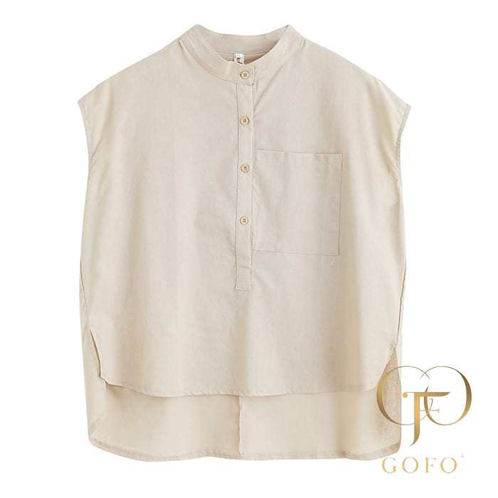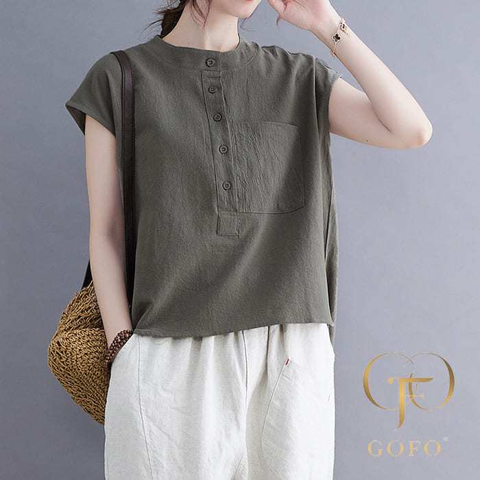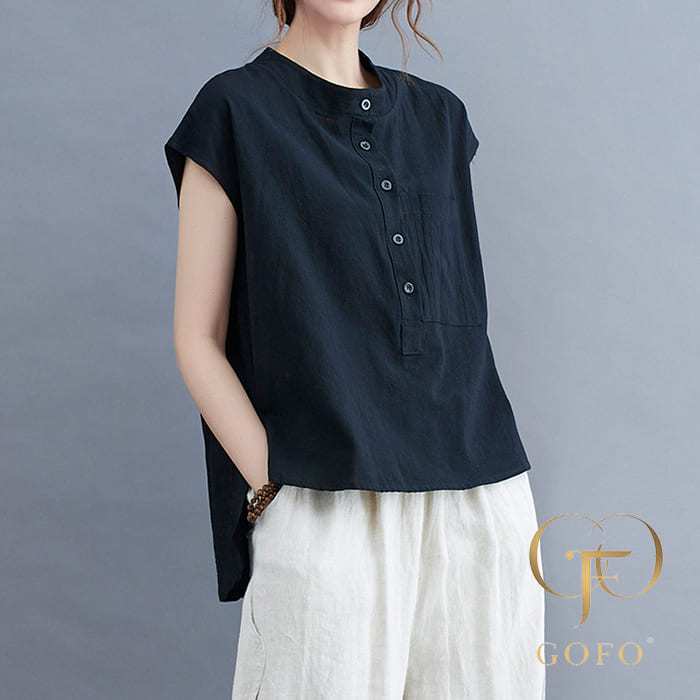 GOFO 短袖上衣 中大尺碼 韓系穿搭 圓領無袖 排扣 顯瘦 夏季穿搭 女生服飾 女裝 舒適純色棉麻 夏天服裝 短袖襯衫