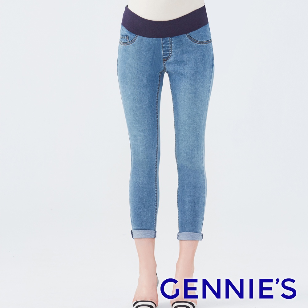 【Gennies 奇妮】經典彈力牛仔窄管褲-淺牛仔藍(T4D04)S|M|L|XLMaternity BottomsGennies 奇妮孕哺(官方旗艦店)