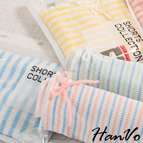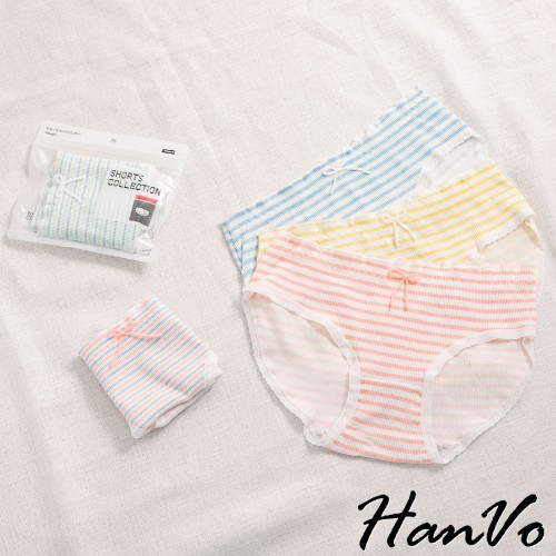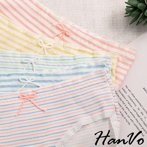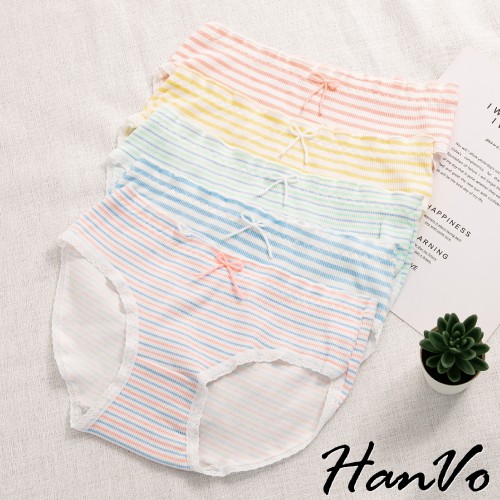 【HanVo】粉嫩糖果色條紋花邊棉質中腰內褲 甜美舒適彈性少女日系三角褲 親膚透氣流行內褲內著 A11-5557