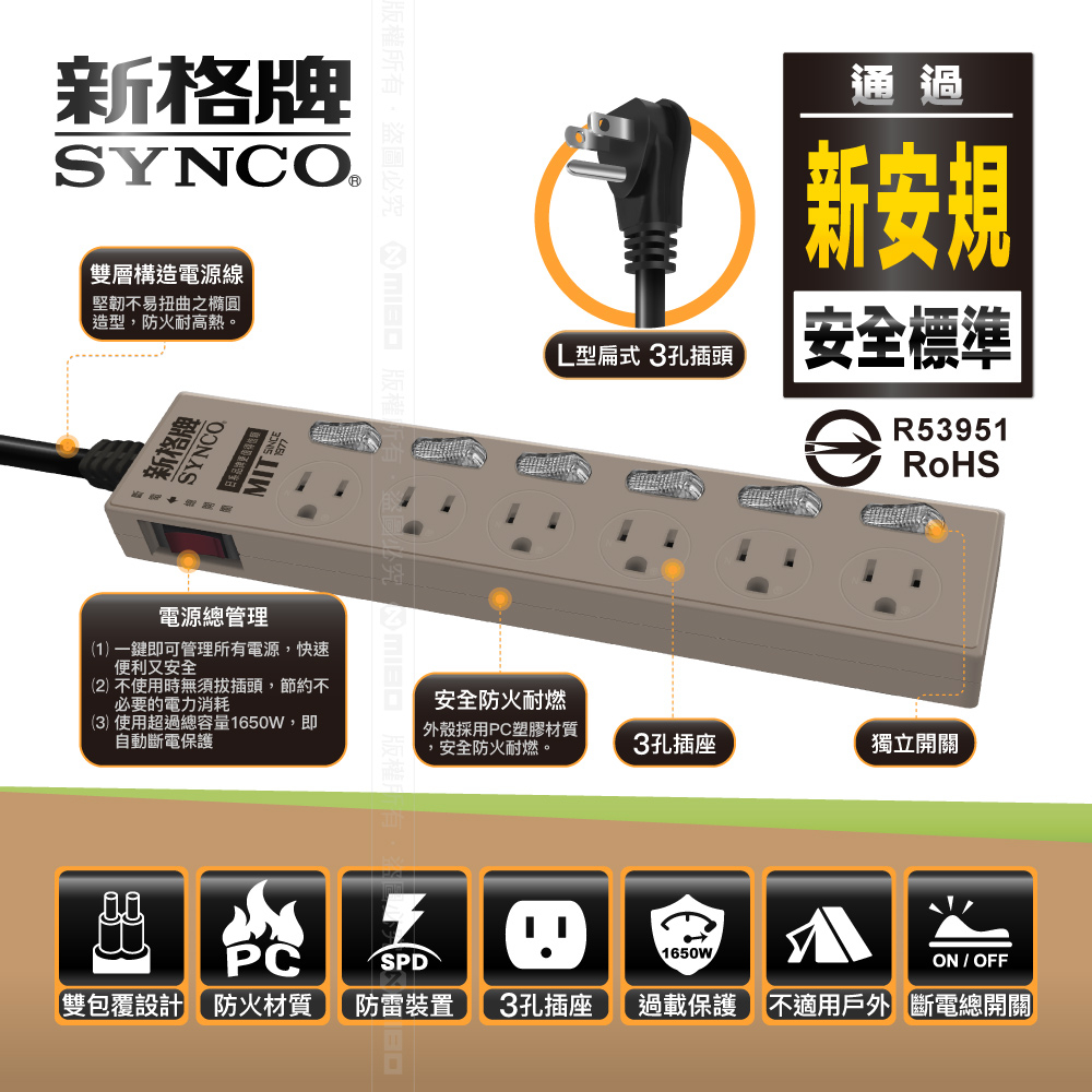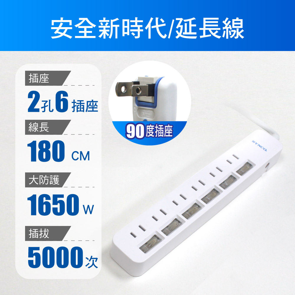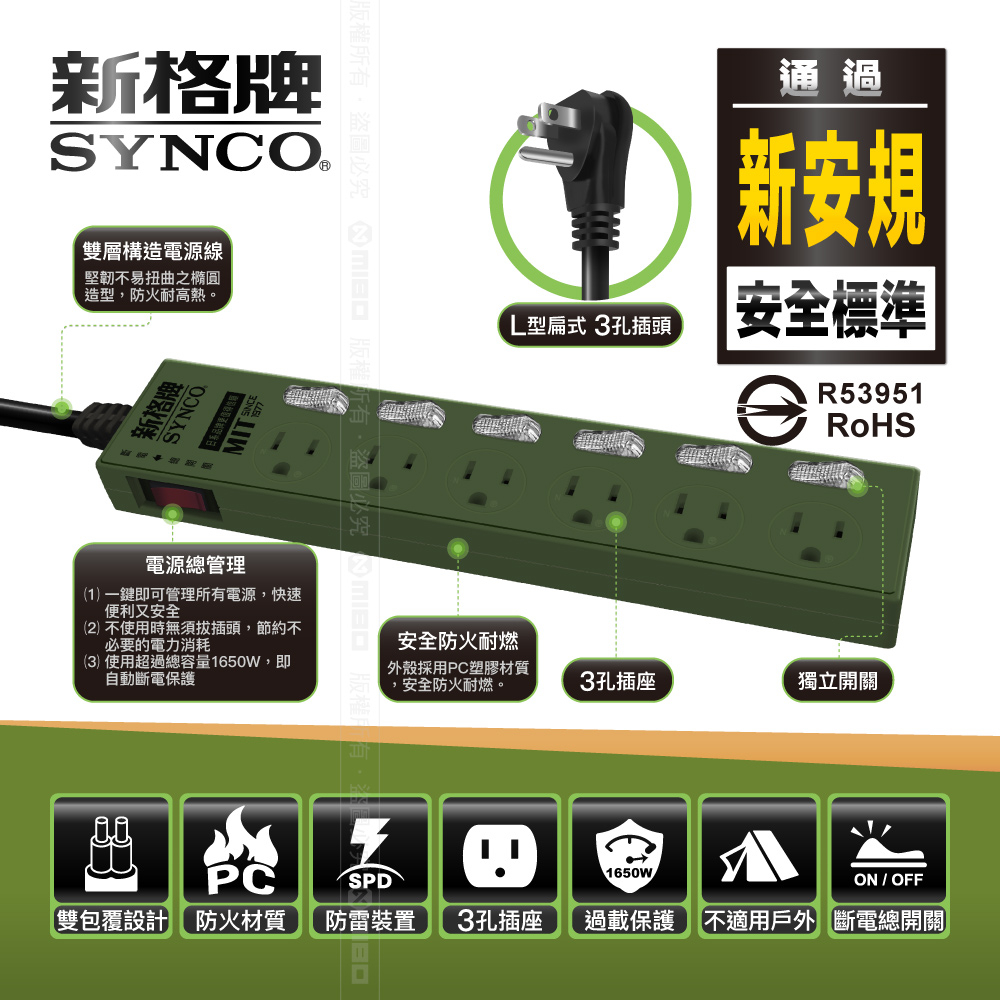 SYNCO 新格牌 新安規 雙層絕緣 防突波 過載自動斷電 安全延長線 附發票 甜甜價 2孔 6尺/9尺六開2孔6座六尺SY-626L6-ES|單開2孔3座六尺SY-123L6-ES|單開2孔3座九尺SY-123L9-ES|三開2孔3座六尺SY-323L6-ESElectric Sockets & Extension CordsMICHELIN 米其林生活精品官方旗艦館
