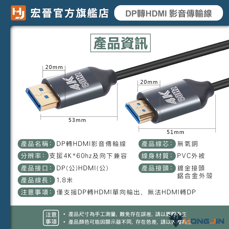 DP轉HDMI影音線 DP線 4K 60Hz 鋁合金 影音傳輸線 DisplayPort 轉接線 4k電視 HDMIDP轉HDMI影音線 DP線 4K 60Hz 鋁合金 影音傳輸線 DisplayPort 轉接線 4k電視 HDMIHONG JIN 宏晉 |3C資訊廣場