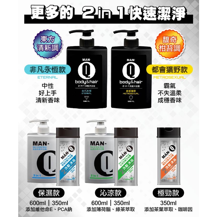 MAN-Q 2in1非凡永恆洗髮沐浴露 (600ml) 雙效 洗髮沐浴一瓶搞定 男人自信魅力的味道MAN-Q 2in1非凡永恆洗髮沐浴露 (600ml) 雙效 洗髮沐浴一瓶搞定 男人自信魅力的味道Body Wash & SoapMAN-Q專業男士保養清潔品牌-官方正品公司貨