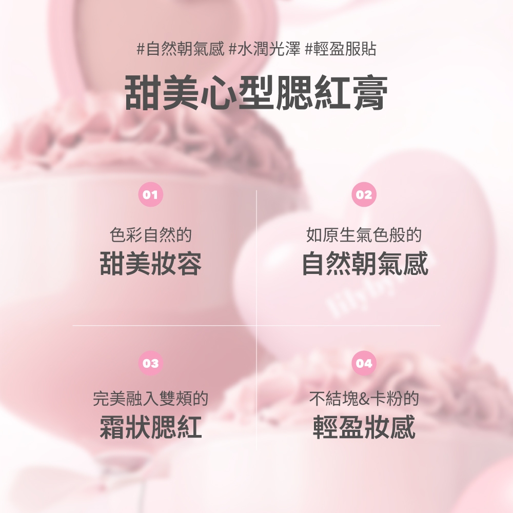 lilybyred 新色上市 甜美心型腮紅膏 3.5g好評回歸❤️🔥 07 紅潤光|全新上市🆕 13 羞澀光|01 甜美光|熱銷🥇 02 清純光|03 感性光|04 心動光|熱銷🥉 05 心機光|熱銷🥈 06 蜜桃光|08 悸動光|09 狂熱光|10 葡萄光|💧 11 暖桃光|💧 12 裸粉光|迷你鑰匙圈腮紅膏 08 悸動光 1.6g|迷你鑰匙圈腮紅膏 蜜桃光1.6g(停產)|迷你鑰匙圈腮紅膏 葡萄光1.6g(停產)Facelilybyred 官方旗艦店