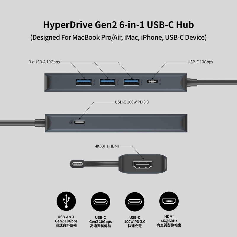 【HyperDrive】 Gen2 6-in-1 USB-C Hub-午夜色【HyperDrive】 Gen2 6-in-1 USB-C Hub-午夜色Network Cables & ConnectorsHyperDrive 台灣官方旗艦店