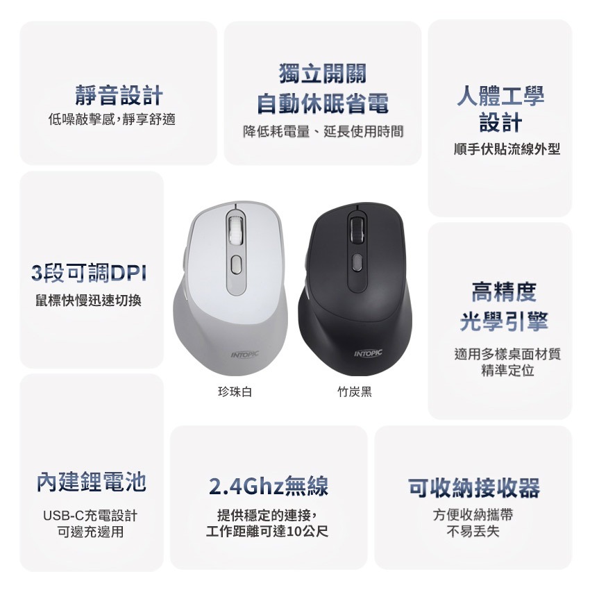 【Intopic】MSW-C160 2.4GHz 充電 極靜音 無線滑鼠黑色|灰白色MiceIntopic廣鼎國際 | 官方3C旗艦館