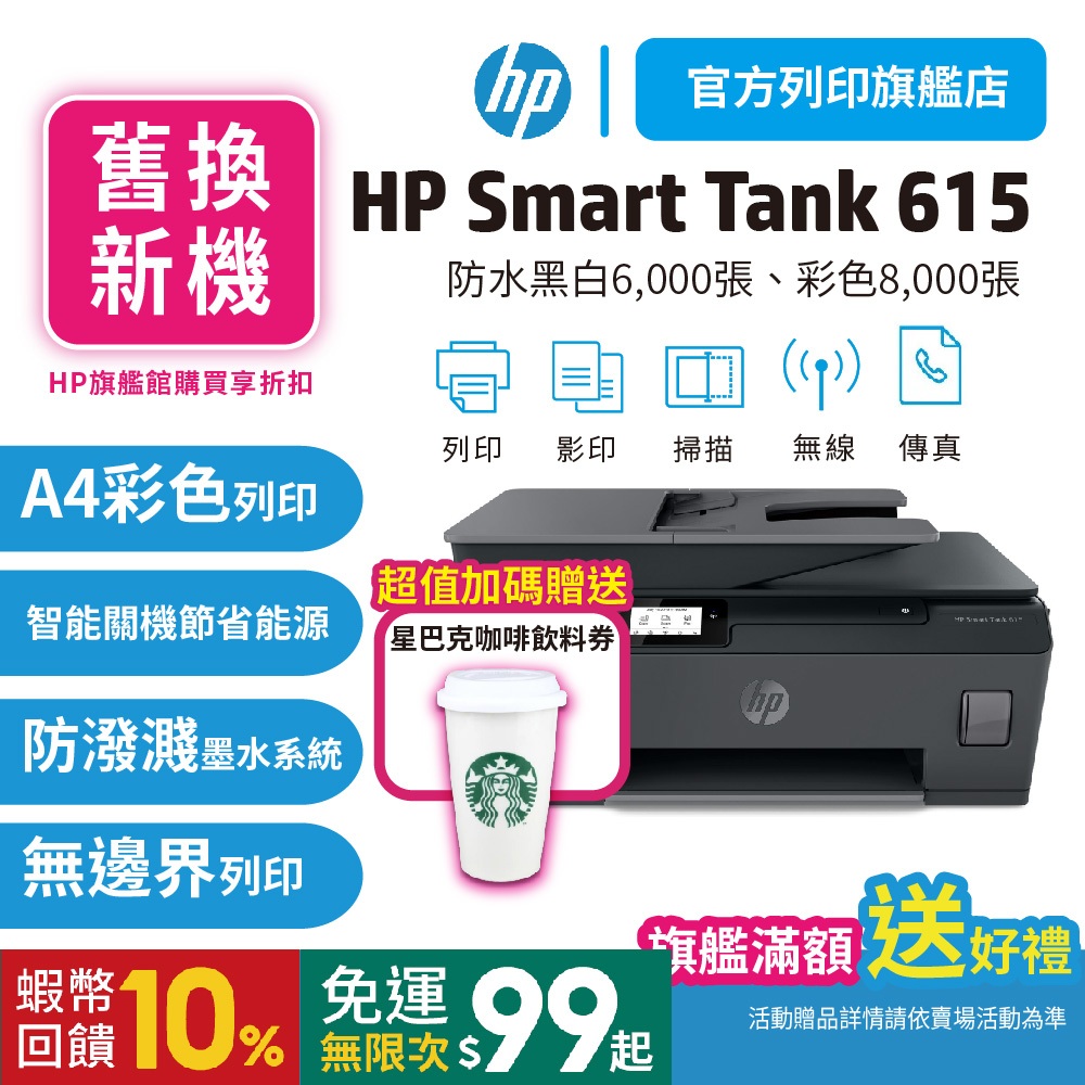 HP Smart Tank 615【旗艦館舊換新機優惠+送星巴克咖啡券】彩色無線傳真連續供墨多功能印表機<滿額加送好禮>舊換新機優惠+送星巴克咖啡券Printers, Scanners & Photocopy MachinesHP惠普官方列印旗艦館 家用 | 商用列印方案