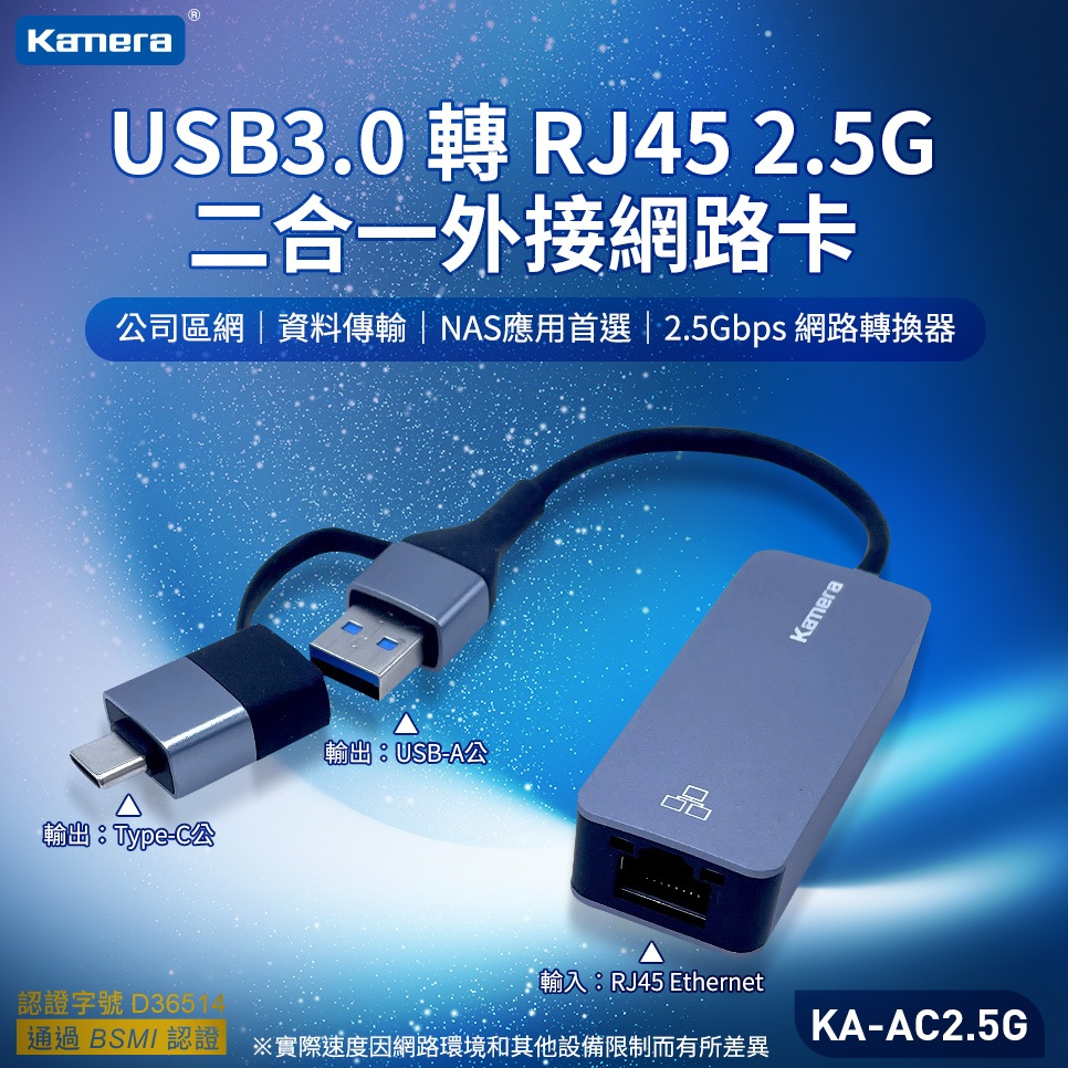 Kamera USB3.0 轉 RJ45 2.5G 二合一外接網路卡 網路轉換器 (KA-UA2.5G)Kamera USB3.0 轉 RJ45 2.5G 二合一外接網路卡 網路轉換器 (KA-UA2.5G)Modems & Wireless RoutersKamera 佳美能旗艦館