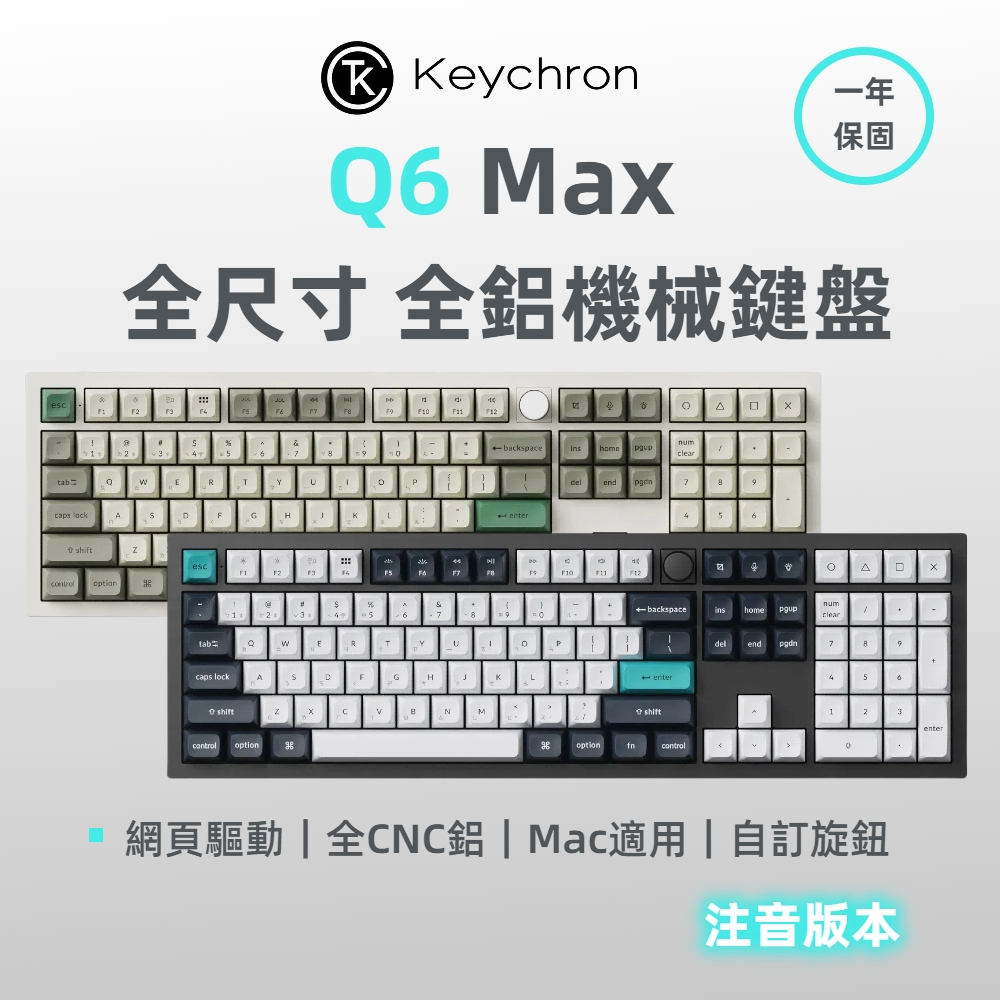 Keychron Q6 Max 全尺寸 全鋁無線機械鍵盤(含旋鈕) 注音 2.4G 藍牙 RGB Mac 熱插拔貝殼白色,茶軸 (段落)|碳黑色,紅軸 (線性)|碳黑色,茶軸 (段落)|貝殼白色,紅軸 (線性)|貝殼白色,香蕉軸 (提前大段落)|碳黑色,香蕉軸 (提前大段落)KeyboardsKeychron臺灣官方旗艦店
