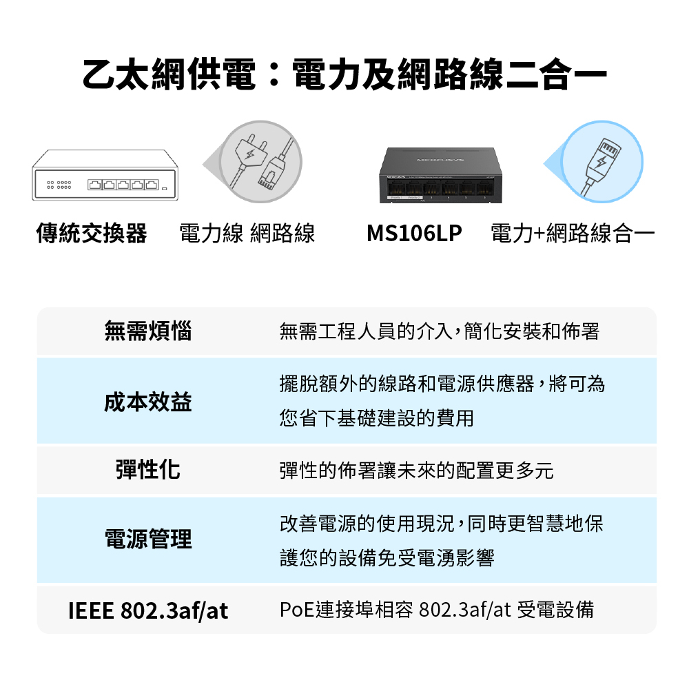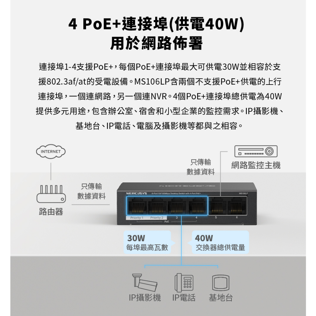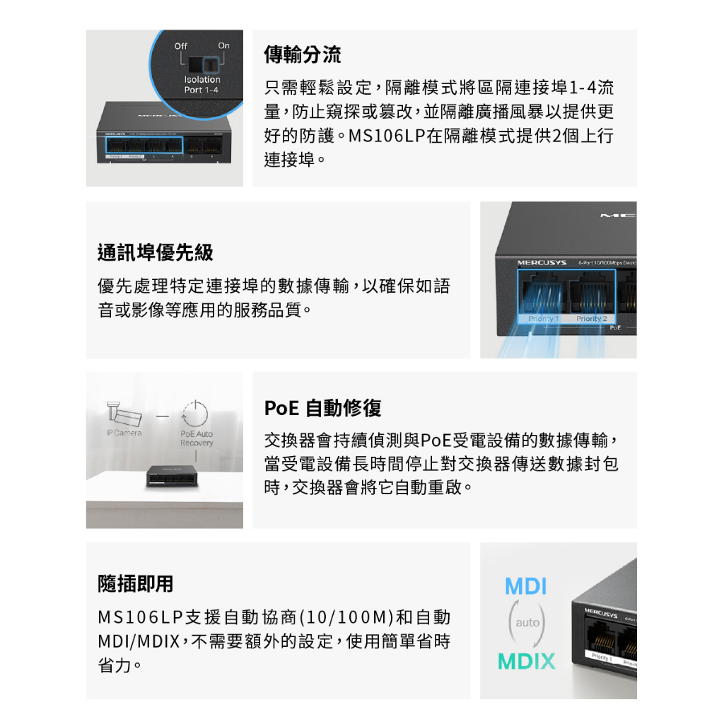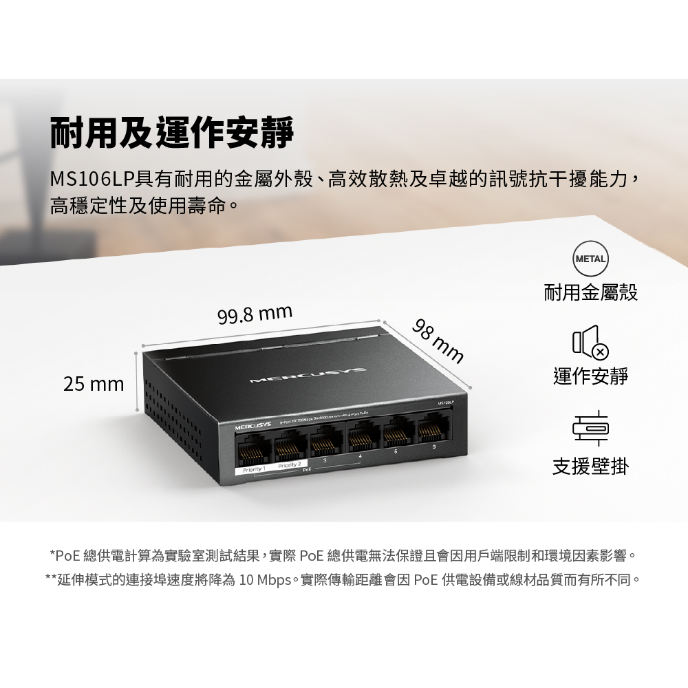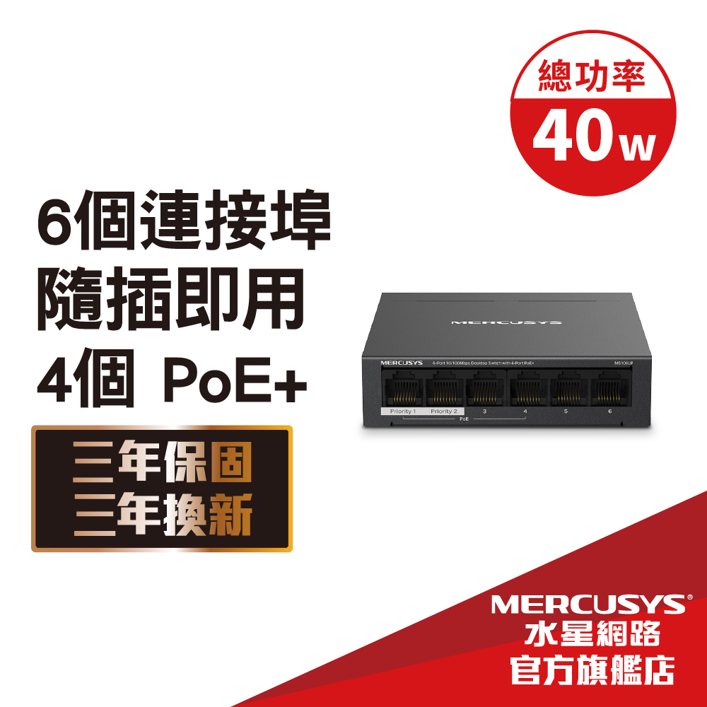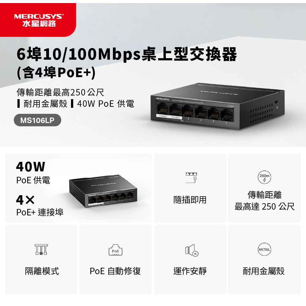 Mercusys水星網路 MS106LP 6埠 10/100Mbps 含4埠 PoE+ 桌上型交換器 金屬外殼 隨插即用MS106LP|【福利品】MS106LPNetwork Switches & PoEMercusys水星 官方旗艦店
