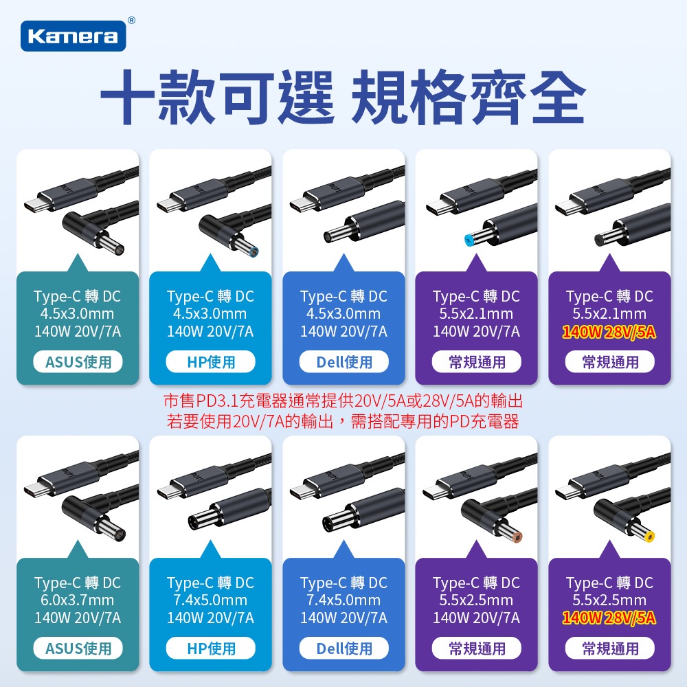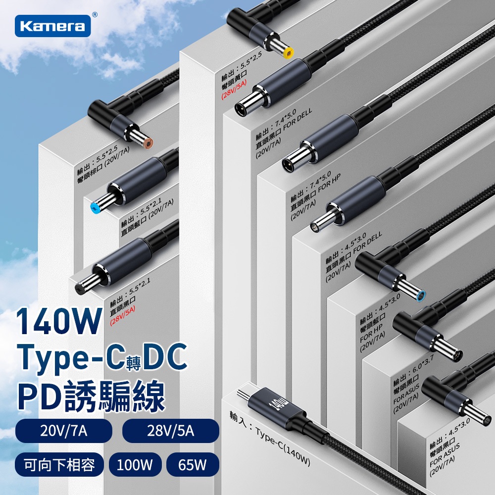 Kamera Type-C公 轉 DC公 140W PD誘騙線 (1.8M) 20V/7A 28V/5A4530直頭黑口-Dell 20V/7A|4530彎頭藍口-HP 20V/7A|4530彎頭黑口-ASUS 20V/7A|5521直頭藍口 20V/7A|5521直頭黑口 28V/5A|5525彎頭棕口 20V/7A|5525彎頭黃口 28V/5A|6037彎頭黑口 20V/7A|7450直頭黑口-Dell 20V/7A|7450直頭黑口-HP 20V/7ALaptop Chargers & AdaptorsKamera 佳美能旗艦館
