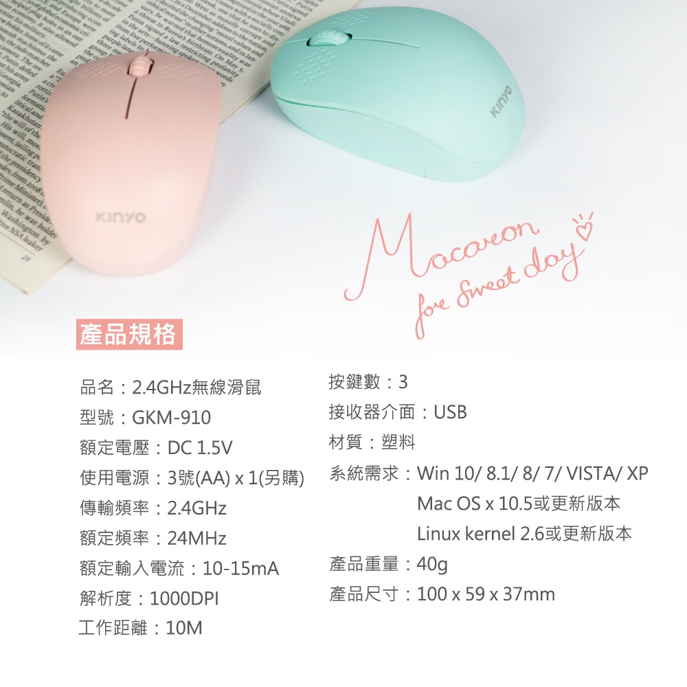 【KINYO官方直營】人體工學馬卡龍無線滑鼠2.4GHz (GKM) 超靜音 USB隨插即用GKM910G 綠色|GKM910PI 粉色MiceKINYO官方旗艦店_3C館