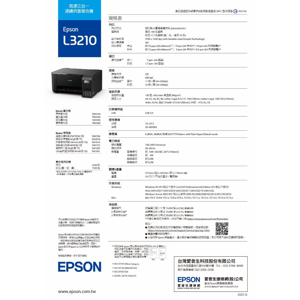 EPSON 愛普生 L3210 高速三合一 多功能連續供墨印表機/掃描/影印/列印 只賣原廠公司貨
