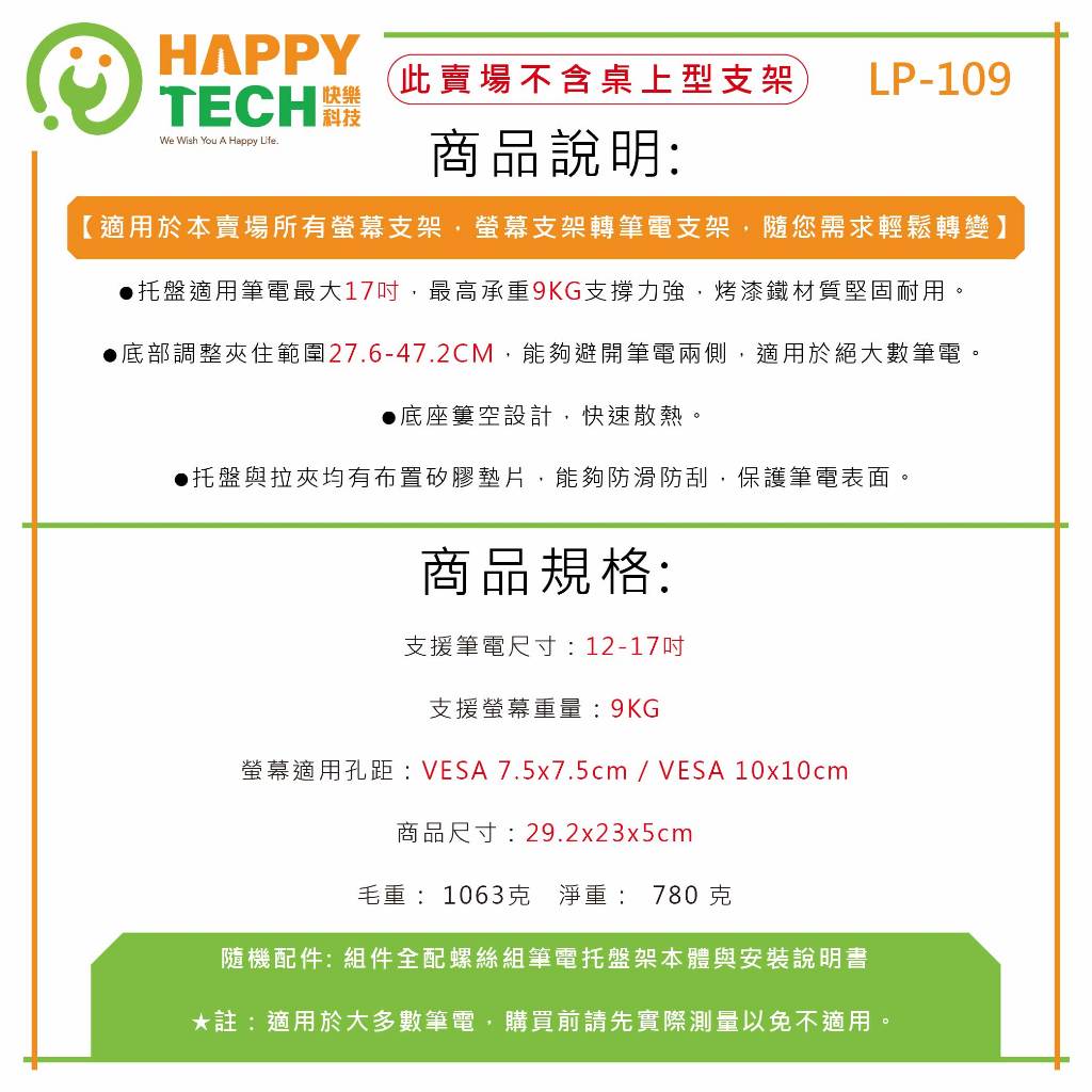 【HappyTech】LP-106進階LP-109新款 VESA通用12-17吋 螢幕支架筆電托盤 筆電散熱座 金屬材【HappyTech】LP-106進階LP-109新款 VESA通用12-17吋 螢幕支架筆電托盤 筆電散熱座 金屬材OthersHappy Tech 品牌旗艦館