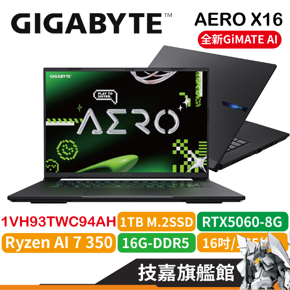 GIGABYTE 技嘉 AERO X16 1VH93TWC94AH RTX5060 太空灰 輕薄 AMD AI 電競筆電原廠標配【16G/1TB】|客製化升級【16G+16G】|客製化升級【16G+16G/1T+1T】GIGABYTE 技嘉旗艦館