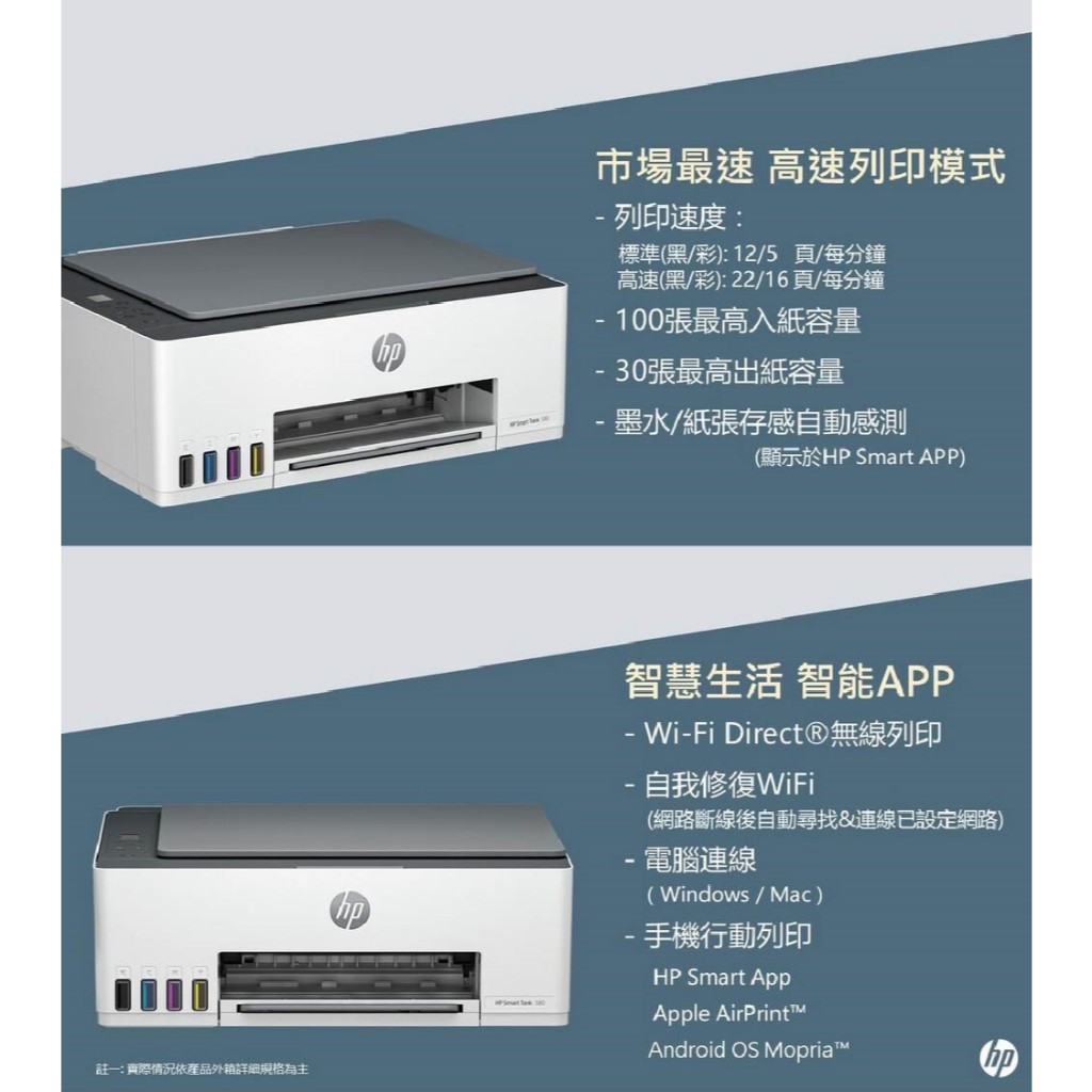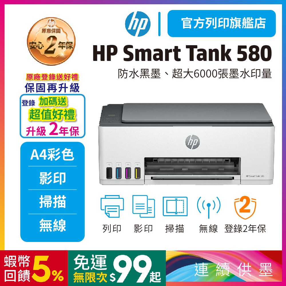 HP Smart Tank 580/ST 580【登錄滿額送贈品+再升級2年保】多功能連供事務機 內含原廠墨水<搶購中>登錄加碼送好禮+升級2年保|【優惠組合】單機+一組墨水 升3年保Printers, Scanners & Photocopy MachinesHP惠普官方列印旗艦館 家用 | 商用列印方案