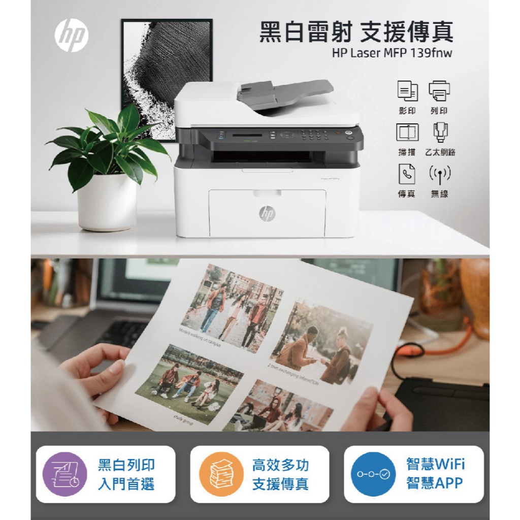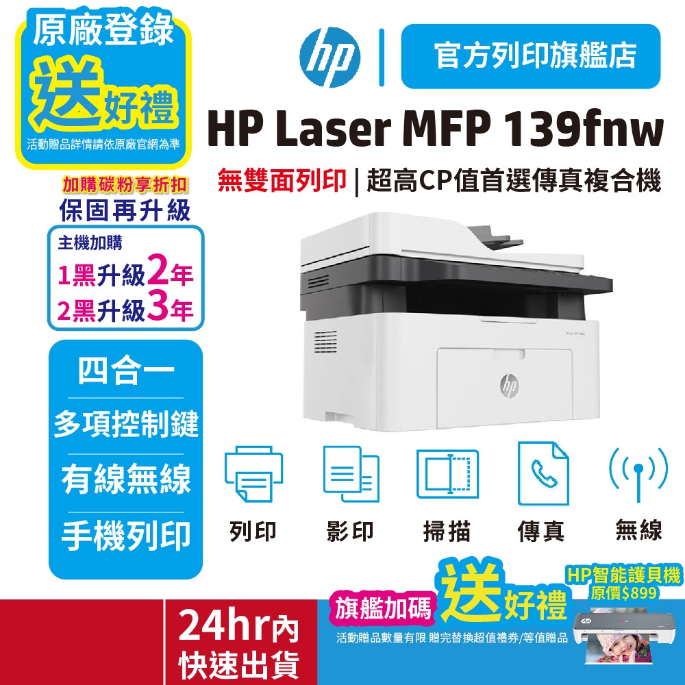 HP 139fnw【登錄送贈品+旗艦優惠送護貝機】無線黑白雷射傳真印表機 適用碳粉 W1112A<加購碳粉享優惠>單機優惠+送護貝機(顏色隨機)Printers, Scanners & Photocopy MachinesHP惠普官方列印旗艦館 家用 | 商用列印方案