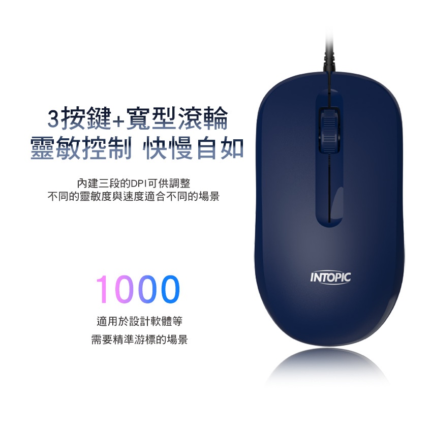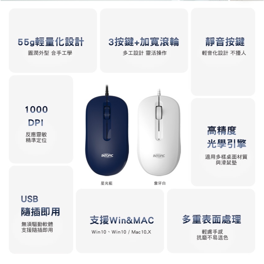 【Intopic】光學有線靜音滑鼠 MS-Q107 按鍵靜音設計 線長1.5公尺 無需驅動與軟體 隨插即用藍色|白色MiceIntopic廣鼎國際 | 官方3C旗艦館