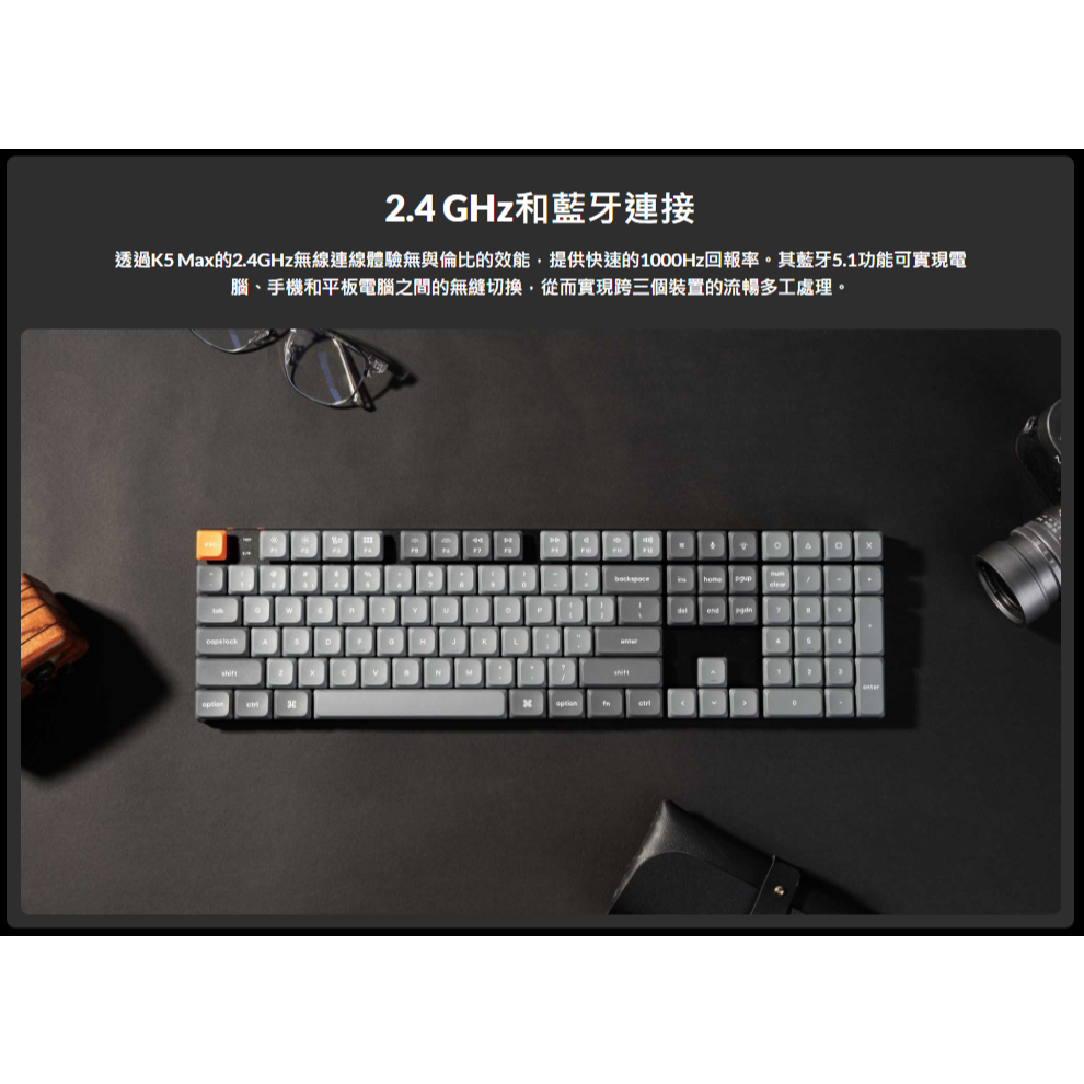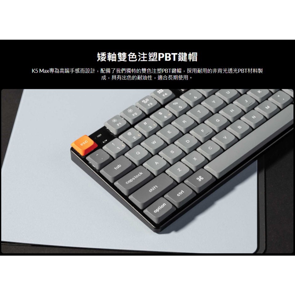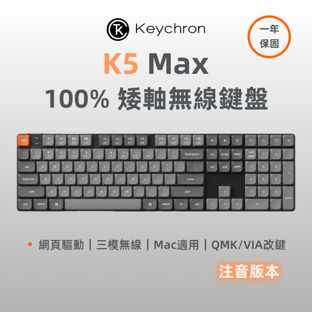 Keychron K5 Max 100% 矮軸無線機械鍵盤 注音 2.4G 藍牙 RGB Mac 熱插拔 QMK/VIA矮紅軸2.0(50克線性),白色背光/非熱插拔(不可換軸)|矮紅軸2.0(50克線性),RGB/熱插拔(可換軸)|矮茶軸2.0(55克段落),白色背光/非熱插拔(不可換軸)|矮茶軸2.0(55克段落),RGB/熱插拔(可換軸)KeyboardsKeychron臺灣官方旗艦店