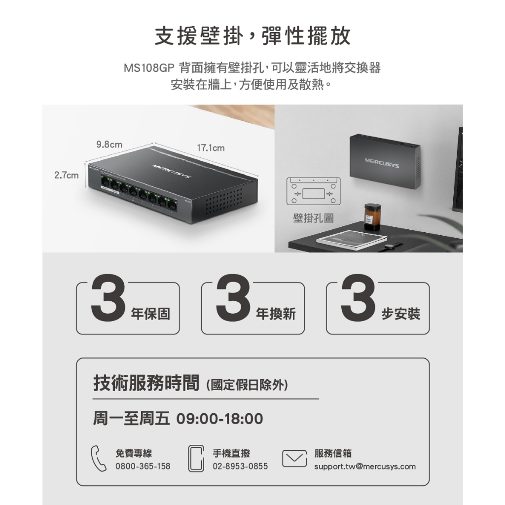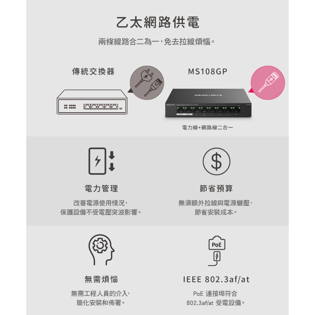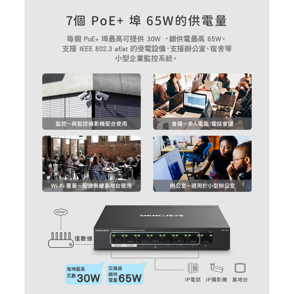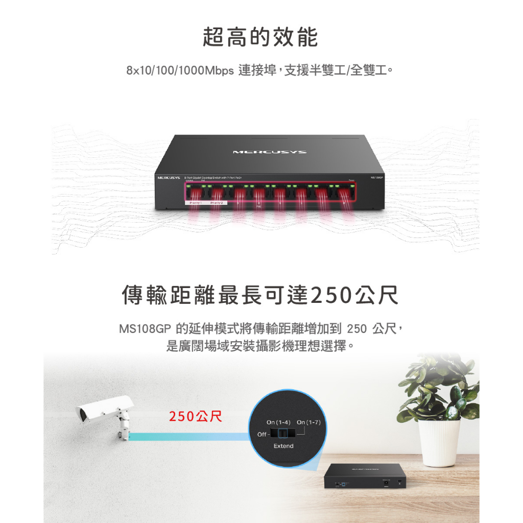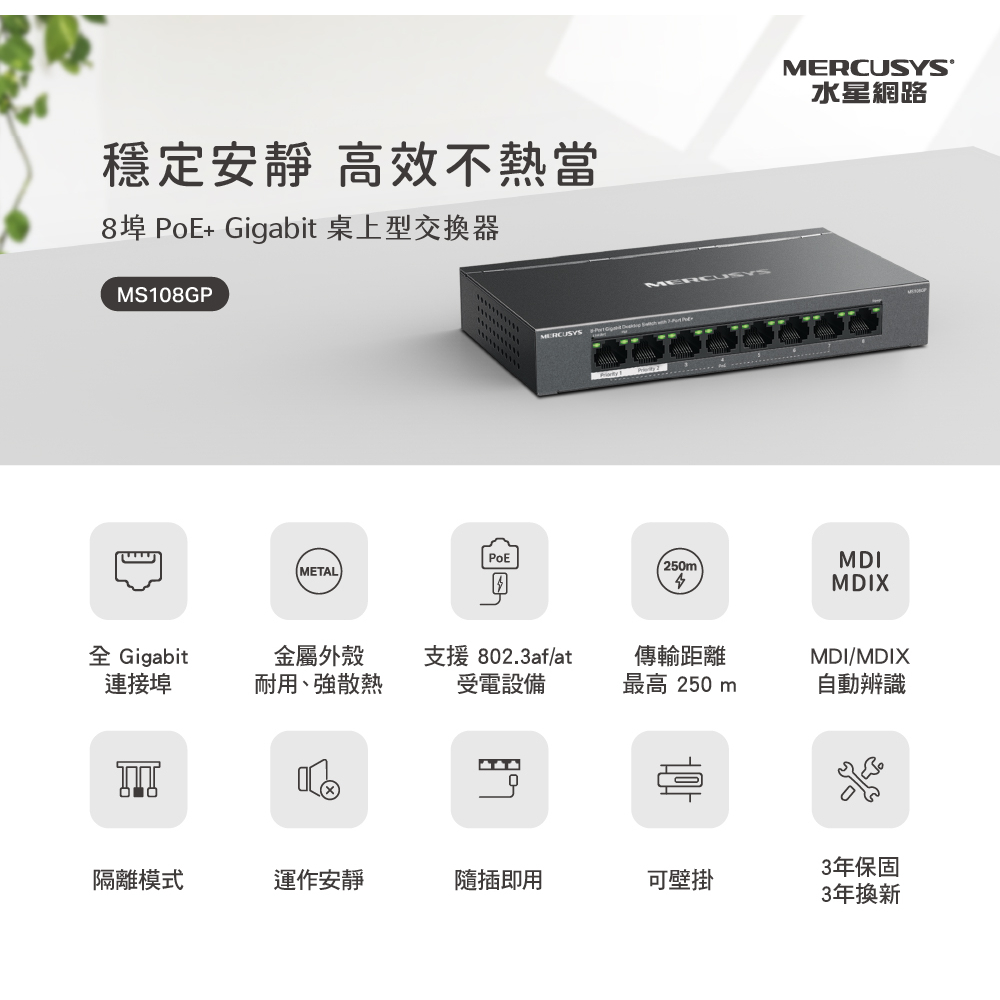 Mercusys水星網路 MS108GP 8 Gigabit 7 PoE+連接埠的 桌上型交換器 金屬外殼 隨插即用MS108GP|【福利品】MS108GPNetwork Switches & PoEMercusys水星 官方旗艦店