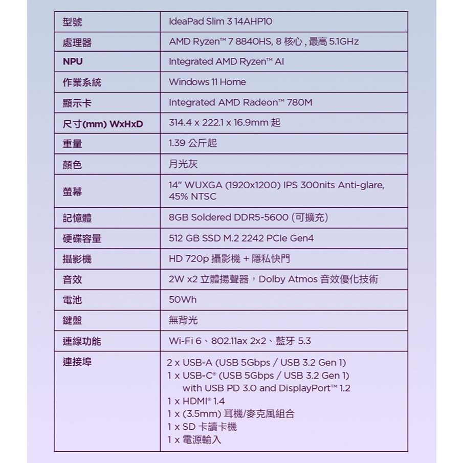 Lenovo 聯想 IdeaPad Slim 3 83K90013TW R7-8840HS 14吋 輕薄筆電灰(升級24G/512G)-需拆封安裝|灰(升級16G/512G)-需拆封安裝|灰(原廠標配8G/512G)Lenovo|聯想官方授權專賣店
