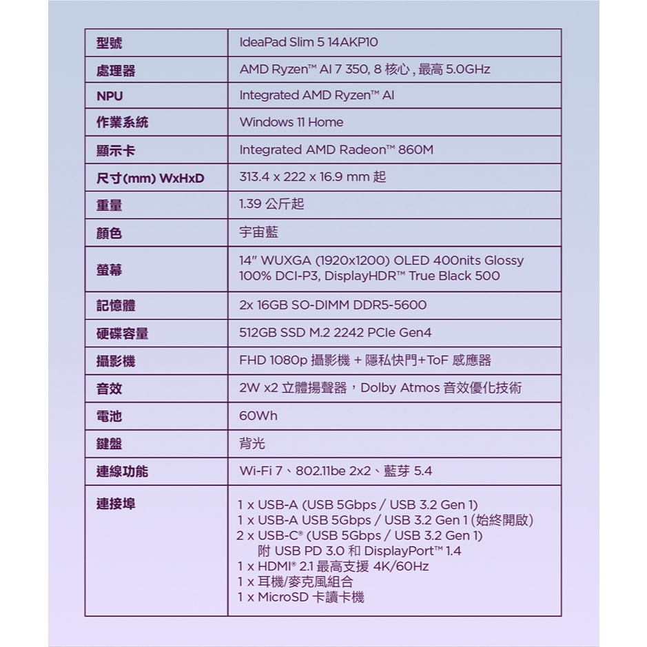Lenovo 聯想 IdeaPad Slim 5 83HX004BTW Ryzen AI 7 350 14吋 效能筆電宇宙藍Lenovo|聯想官方授權專賣店