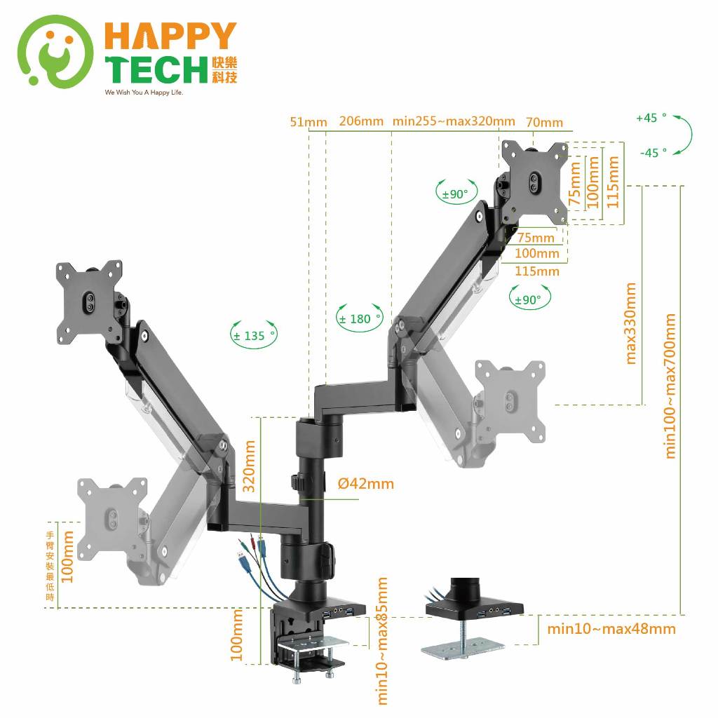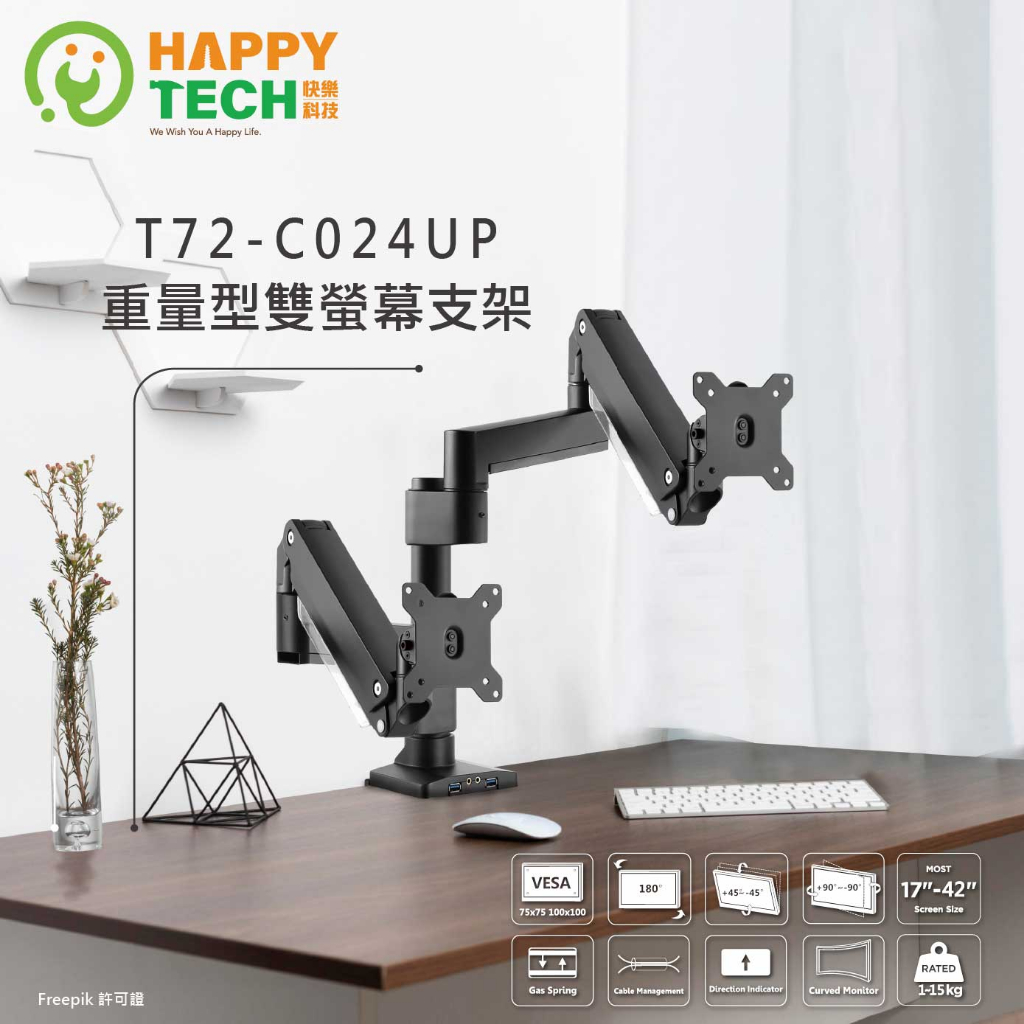 【HappyTech】T72-C024UP 鋁合金17-42吋 雙手臂 懸浮螢幕 大承重氣壓式 桌上型 電腦螢幕支架 夾【HappyTech】T72-C024UP 鋁合金17-42吋 雙手臂 懸浮螢幕 大承重氣壓式 桌上型 電腦螢幕支架 夾OthersHappy Tech 品牌旗艦館