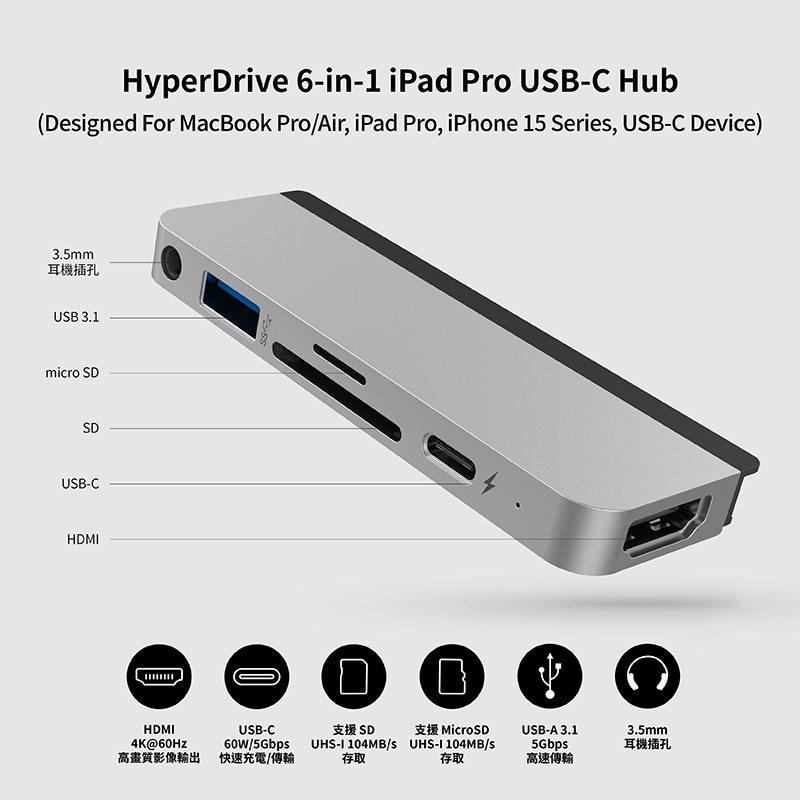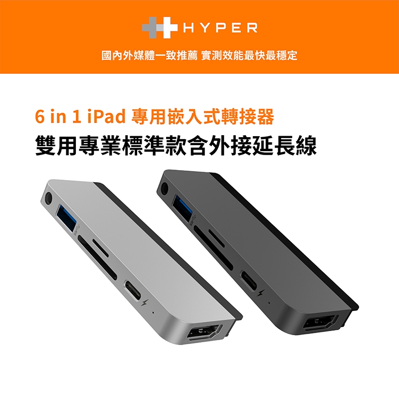 【HyperDrive】6-in-1 iPad Pro USB-C Hub 多功能集線器太空灰|銀Network Cables & ConnectorsHyperDrive 台灣官方旗艦店