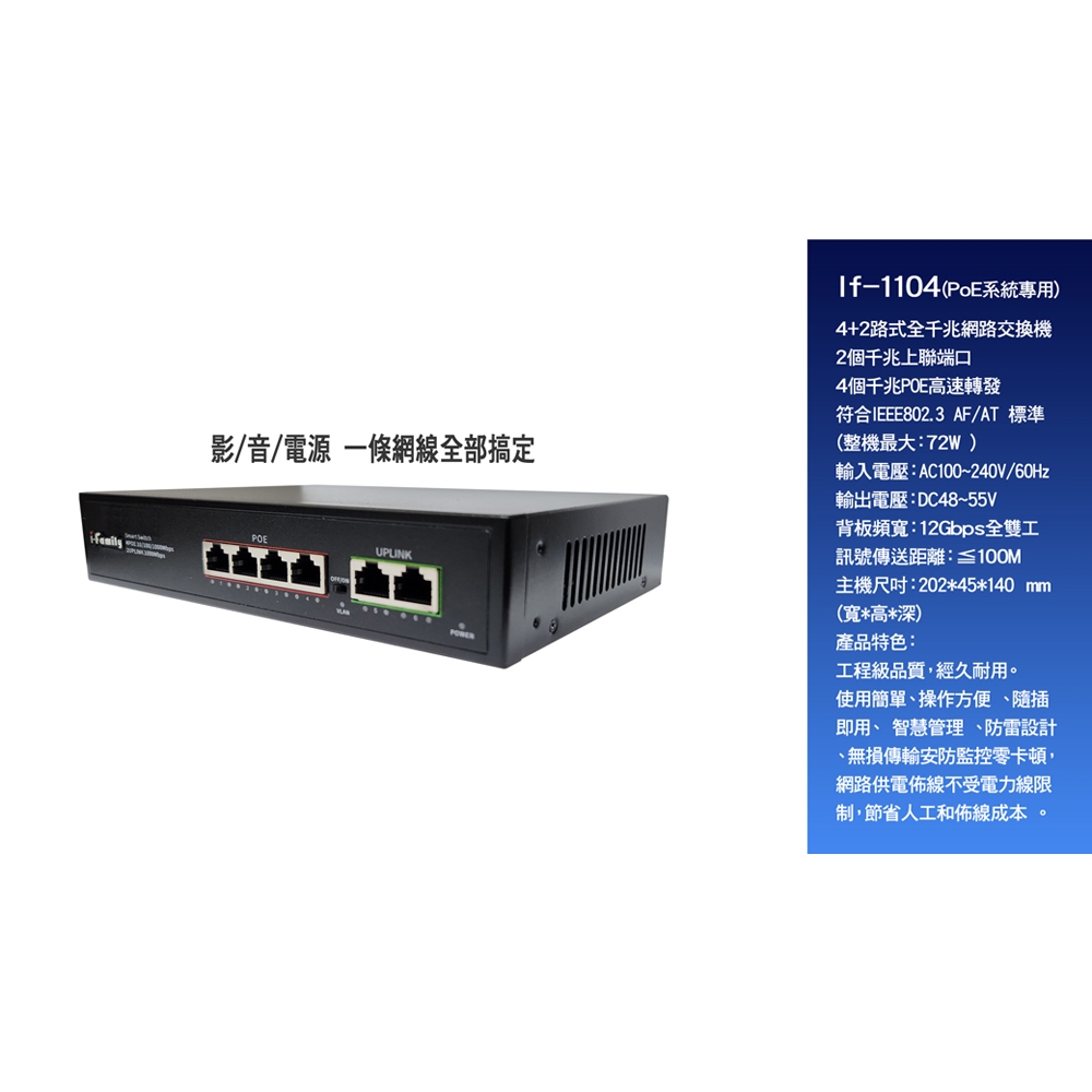 I-Family 工程級 IF-1104 4+2埠 PoE供電 超高速乙太網路供電交換器I-Family 工程級 IF-1104 4+2埠 PoE供電 超高速乙太網路供電交換器Network Switches & PoEI-Family