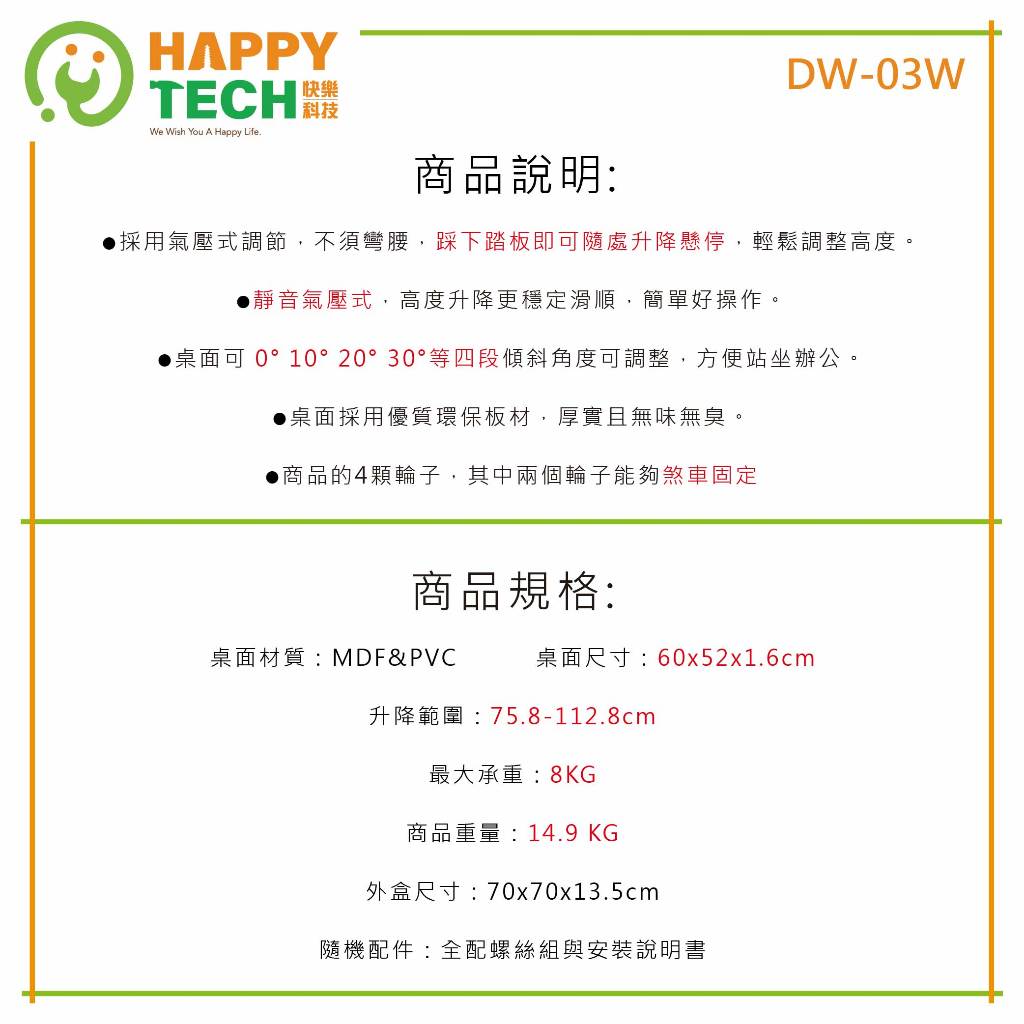 【HappyTech】DW-03W 移動 講台 氣壓升降桌 站立辦公電腦桌 筆電桌 電腦桌辦公桌 站立桌 工作桌 氣壓桌新品OthersHappy Tech 品牌旗艦館