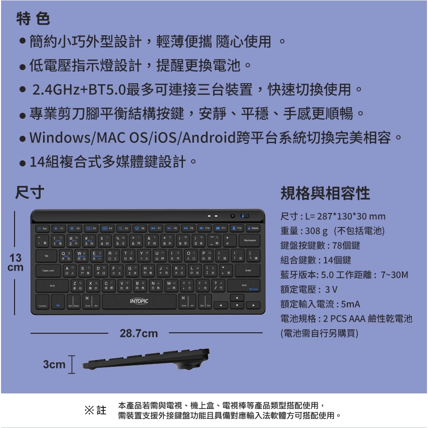 【Intopic】KBT-110 剪刀腳結構 低噪音 可同時連接三台裝置 手機可用 藍牙鍵盤【Intopic】KBT-110 剪刀腳結構 低噪音 可同時連接三台裝置 手機可用 藍牙鍵盤KeyboardsIntopic廣鼎國際 | 官方3C旗艦館