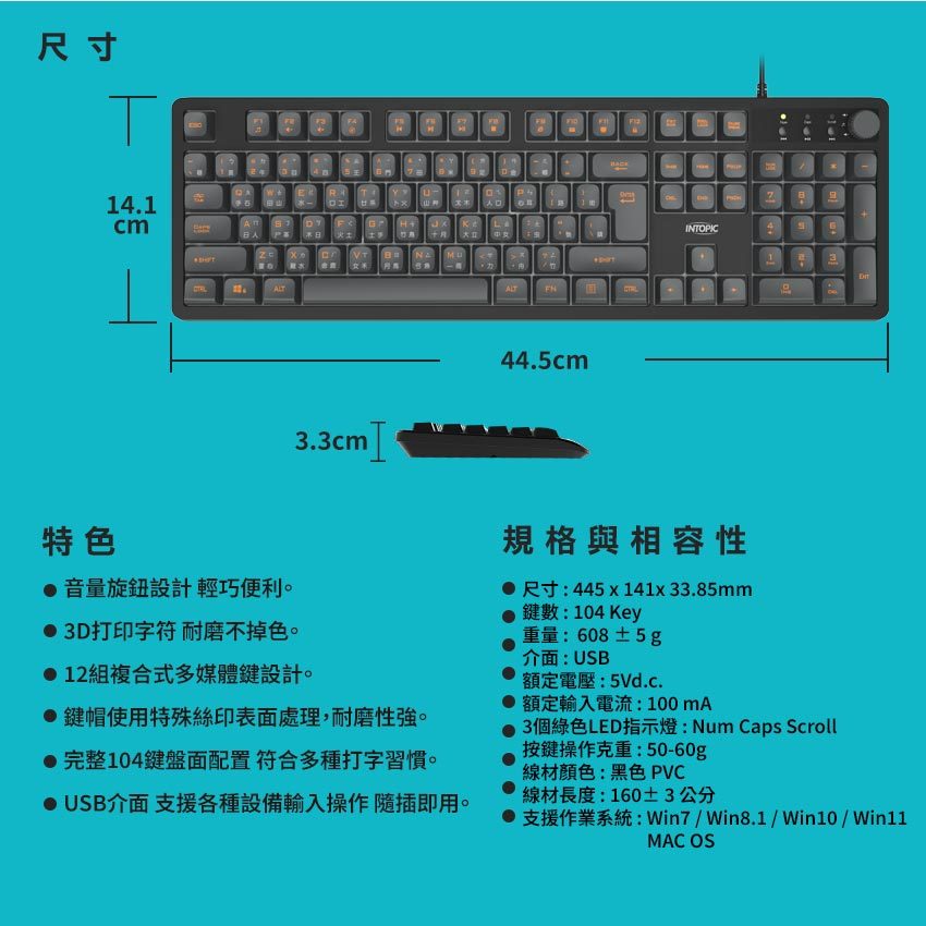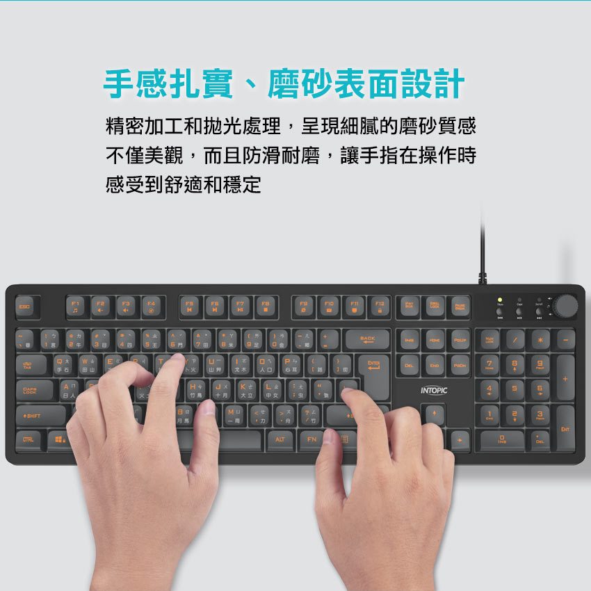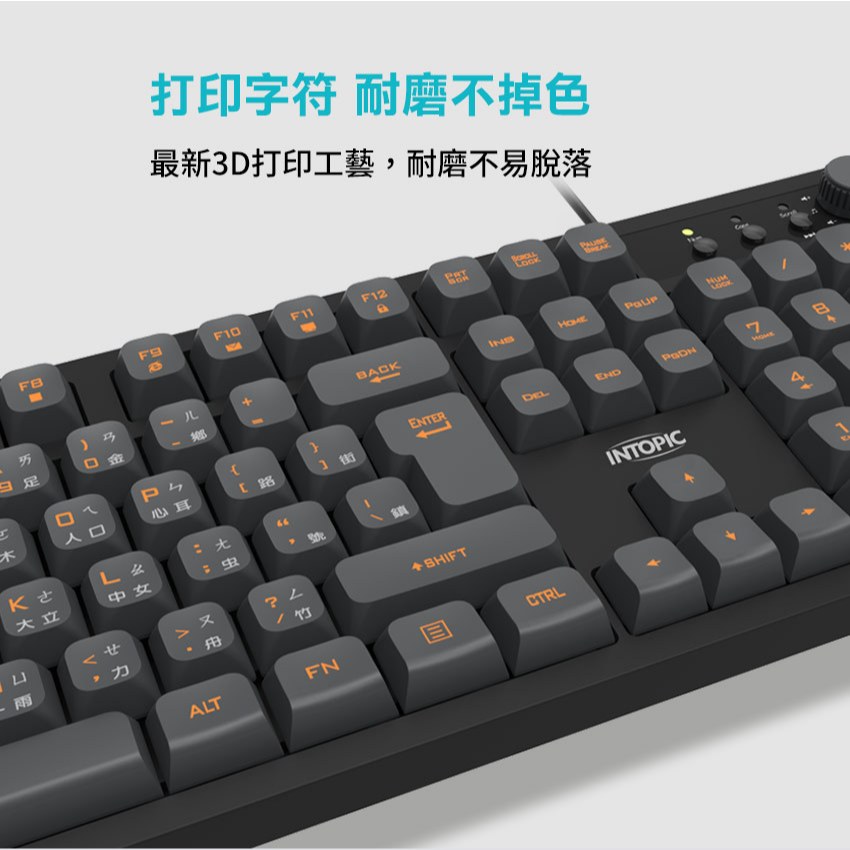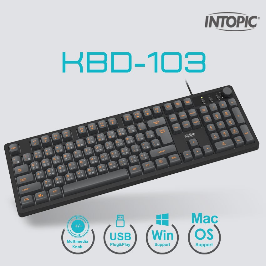 【Intopic】暗焰多媒體有線鍵盤 KBD-103 音量旋鈕 USB 3D打印字符 完整104鍵盤面配置【Intopic】暗焰多媒體有線鍵盤 KBD-103 音量旋鈕 USB 3D打印字符 完整104鍵盤面配置KeyboardsIntopic廣鼎國際 | 官方3C旗艦館