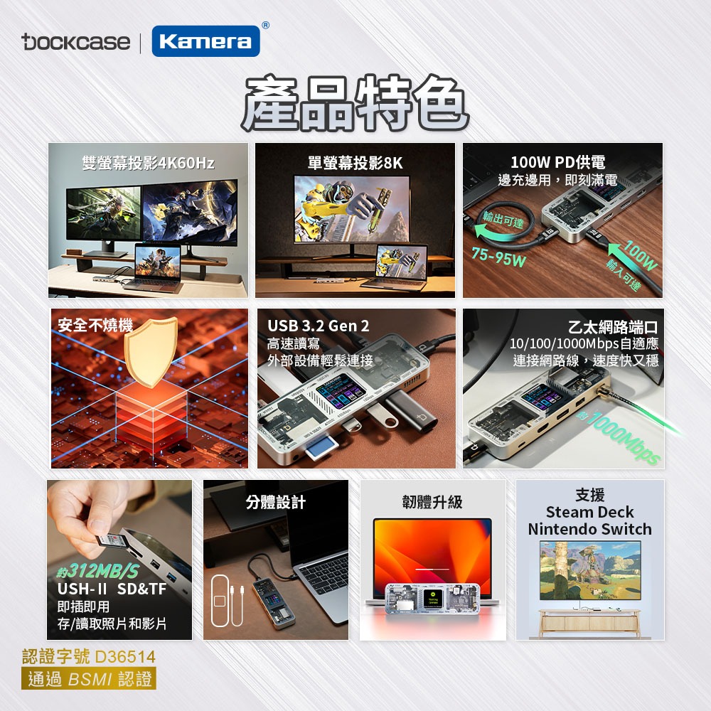 Dockcase 10合1 HUB 6合1 集線器 轉接器 鋁合金大量儲存 快充投影專業款 10合1 銀色|專業款 10合1 黑色|商務款 6合1 銀色(RJ45)|商務款 6合1 黑色(RJ45)|探索款 6合1 銀色Laptop Chargers & AdaptorsKamera 佳美能旗艦館
