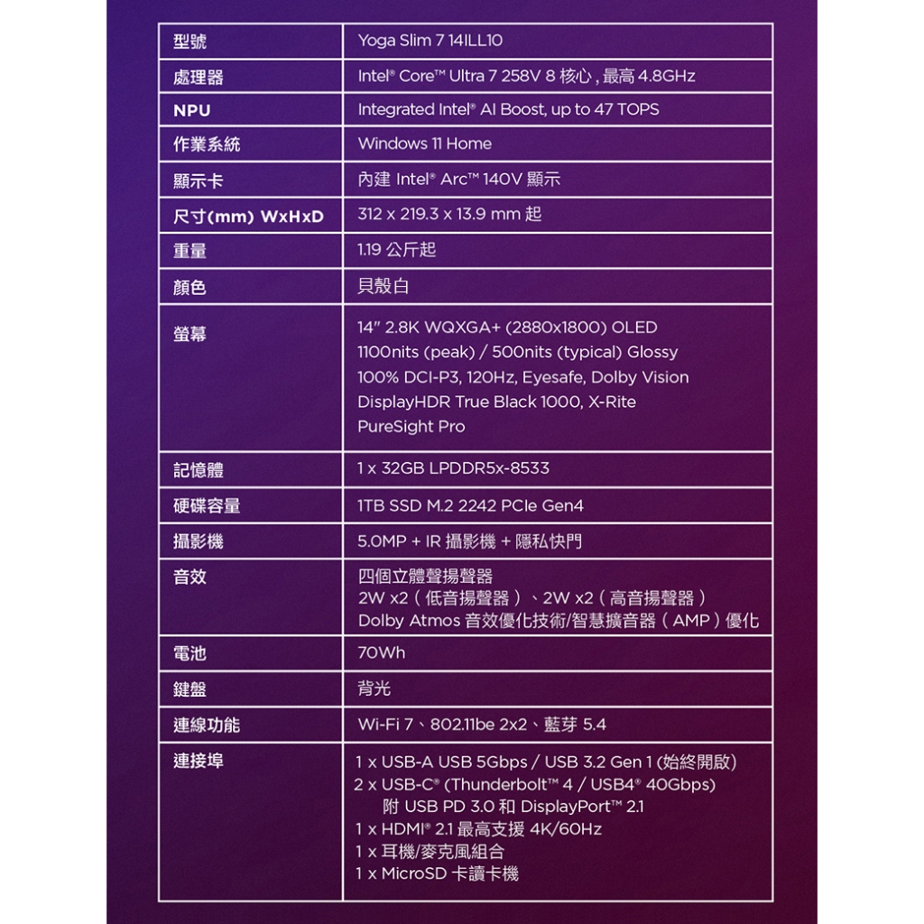 Lenovo 聯想 Yoga Slim 7 83JX0088TW Ultra 7 258V 14吋 輕薄筆電貝殼白Lenovo|聯想官方授權專賣店