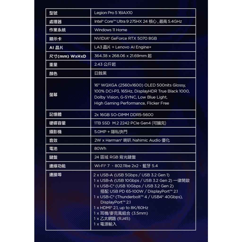 Lenovo 聯想 Legion Pro 5 83F3002ETW Ultra 9 275HX/RTX5070 電競筆電日蝕黑Lenovo|聯想官方授權專賣店