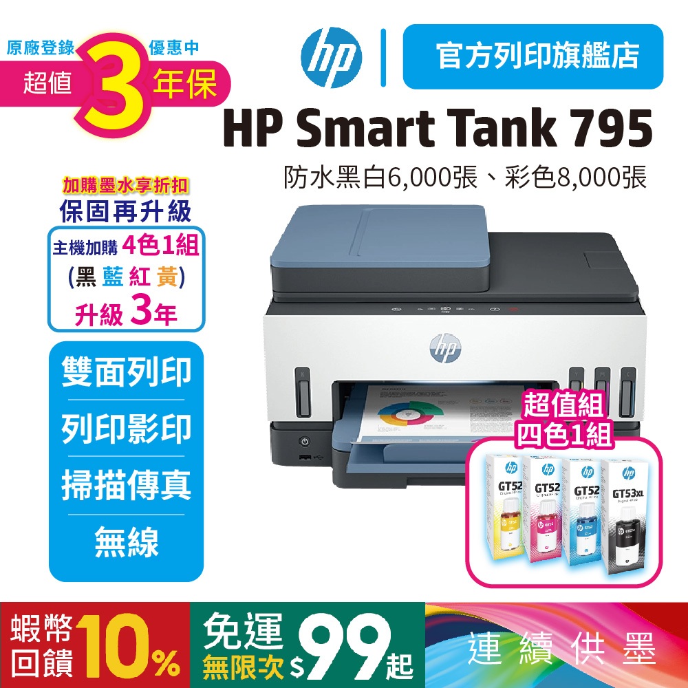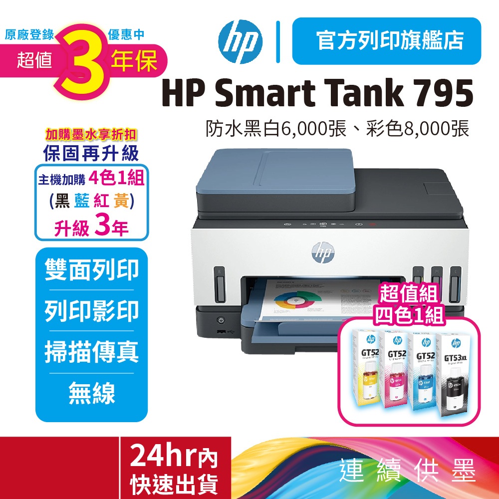 HP Smart Tank 795【3年保優惠組】【加四色組1黑3彩原廠墨水】 Wifi連續供墨傳真複合機<滿額送好禮>【升3年保優惠】795+1黑3彩原廠墨水Printers, Scanners & Photocopy MachinesHP惠普官方列印旗艦館 家用 | 商用列印方案